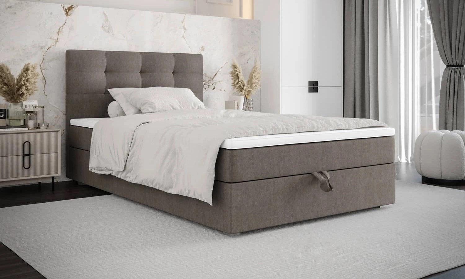 - Das kontinentale Bett Flint ist die perfekte Wahl für ein Jugendzimmer oder ein kleineres Schlafzimmer. Das Design des Bettes bietet große Stabilität und Komfort bei der Benutzung. Die zarte Steppung der Kopfstütze ist ein echter Blickfang.