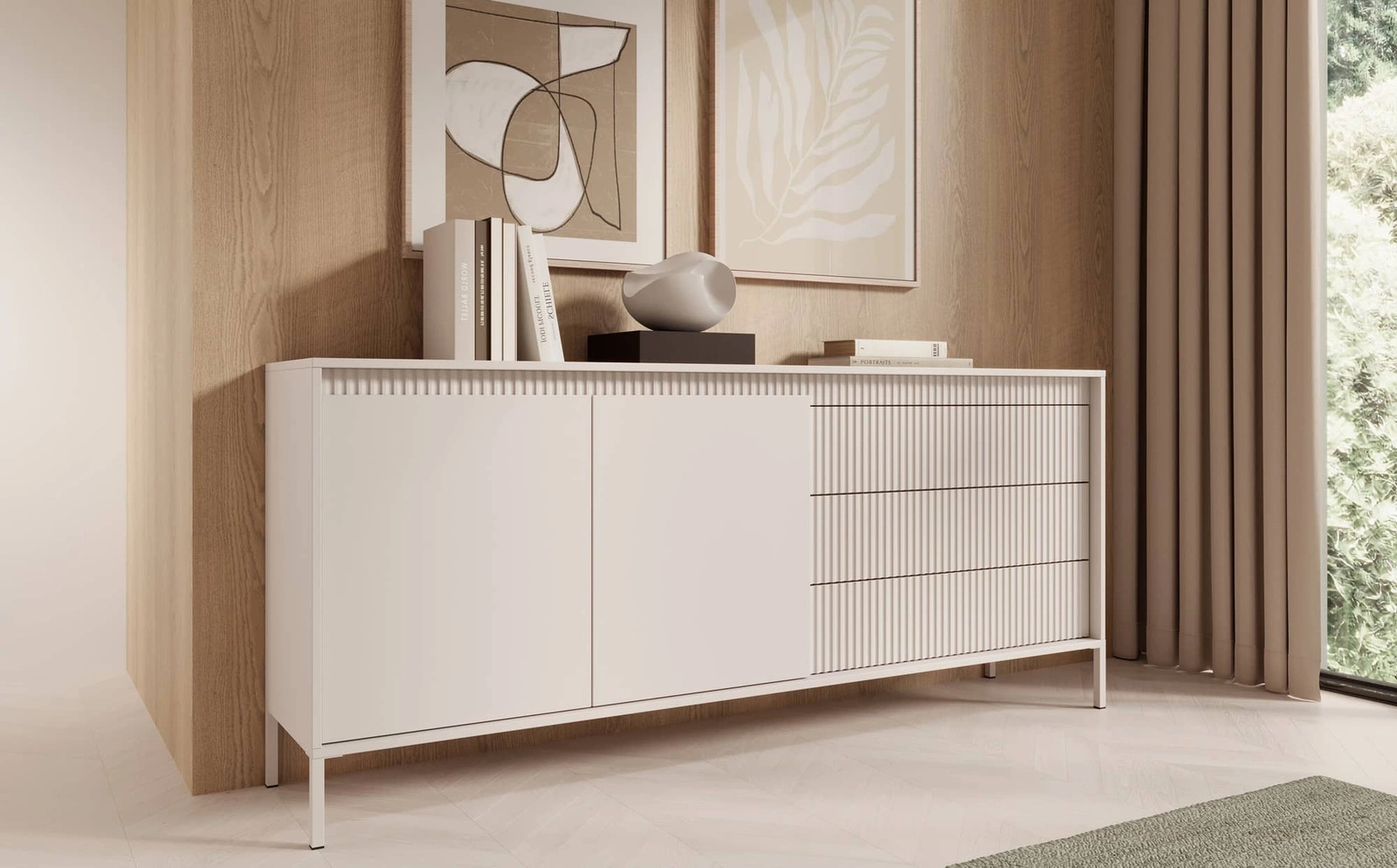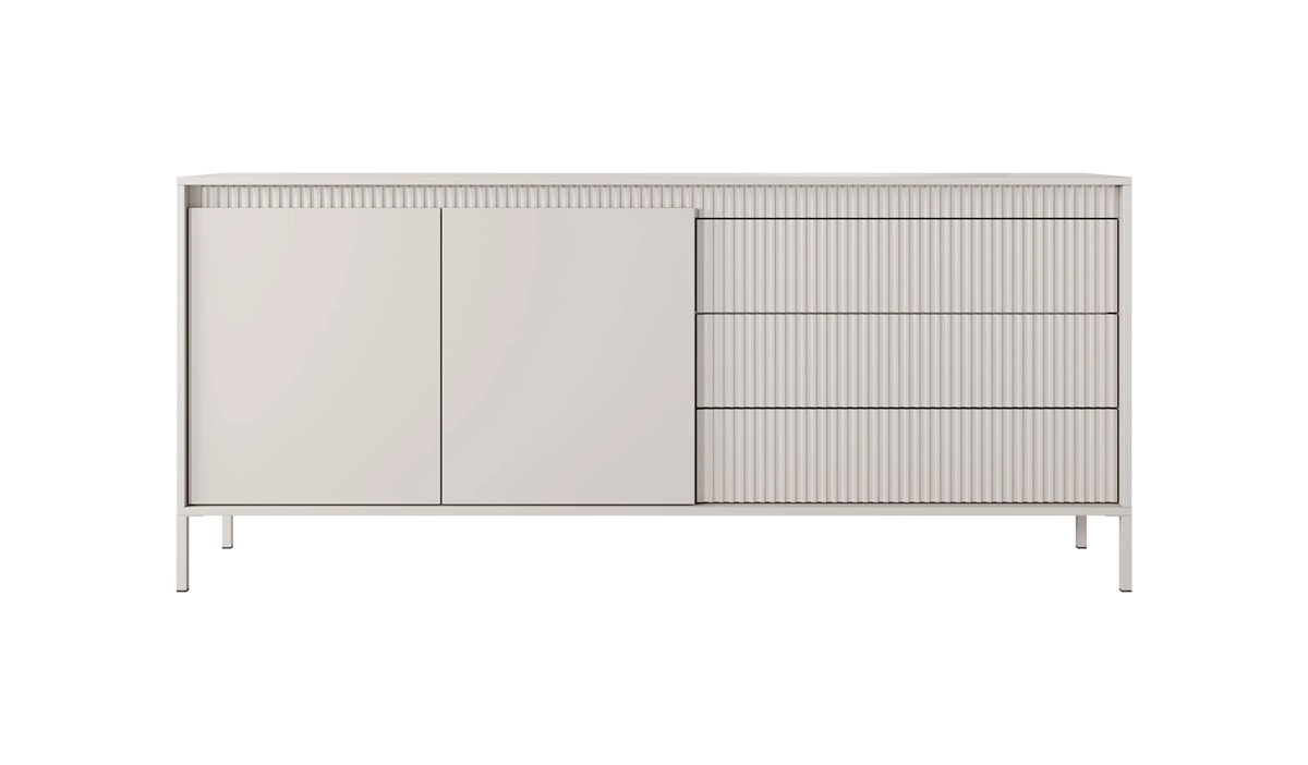 Die 187 cm lange Kommode Sesti in Beige ist das ideale Möbelstück für Liebhaber origineller Designtrends.