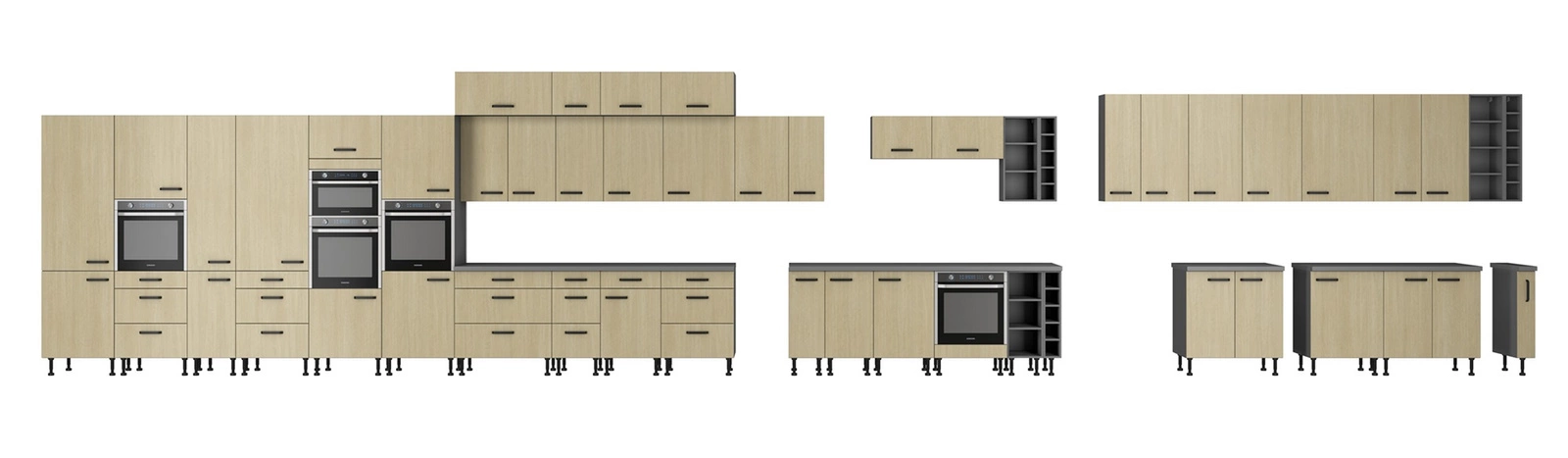 Der Korpus des Küchenschranks ist aus einer hochwertigen laminierter Platte 16 mm dick. Der Vorteil dieser Art von Platten ist hohe Widerstandsfähigkeit gegen äußere Einflüsse wie Dampf, Hitze, verschüttete Flüssigkeiten. ABS-Furnierkanten erhöhen die Haltbarkeit des Küchenschranks.