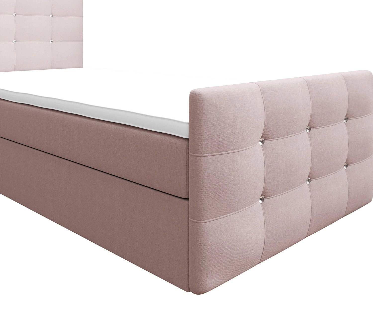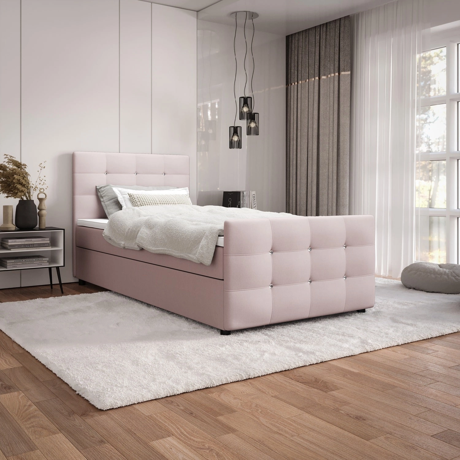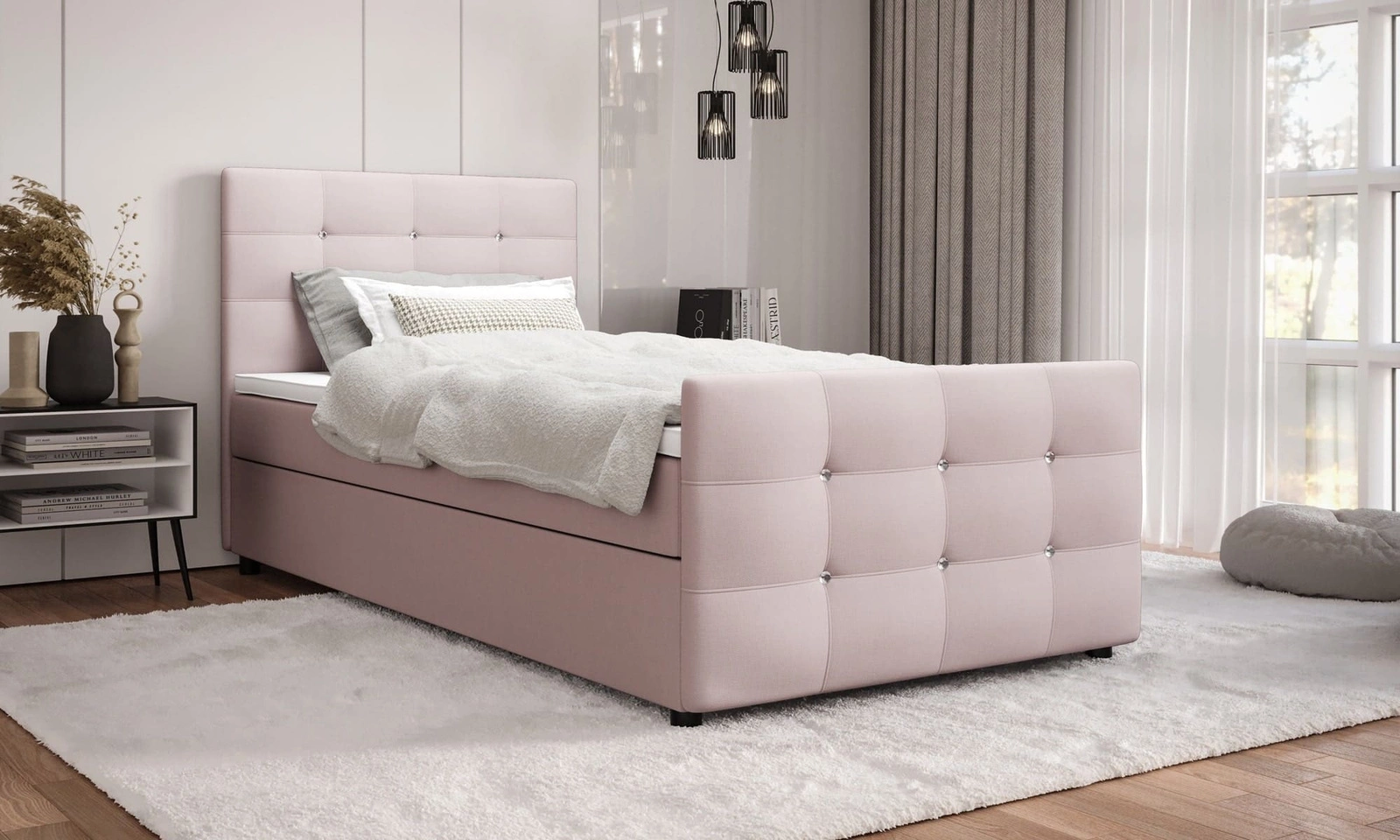 Boxspringbett Kansas 90x200 puderrossa Bett im modernen skandinavischen Stil mit gepolstertem Kopf- und Fußteil