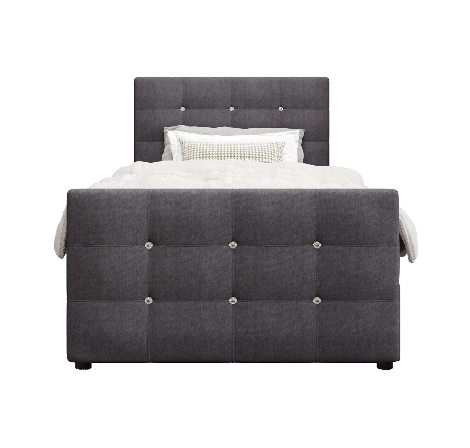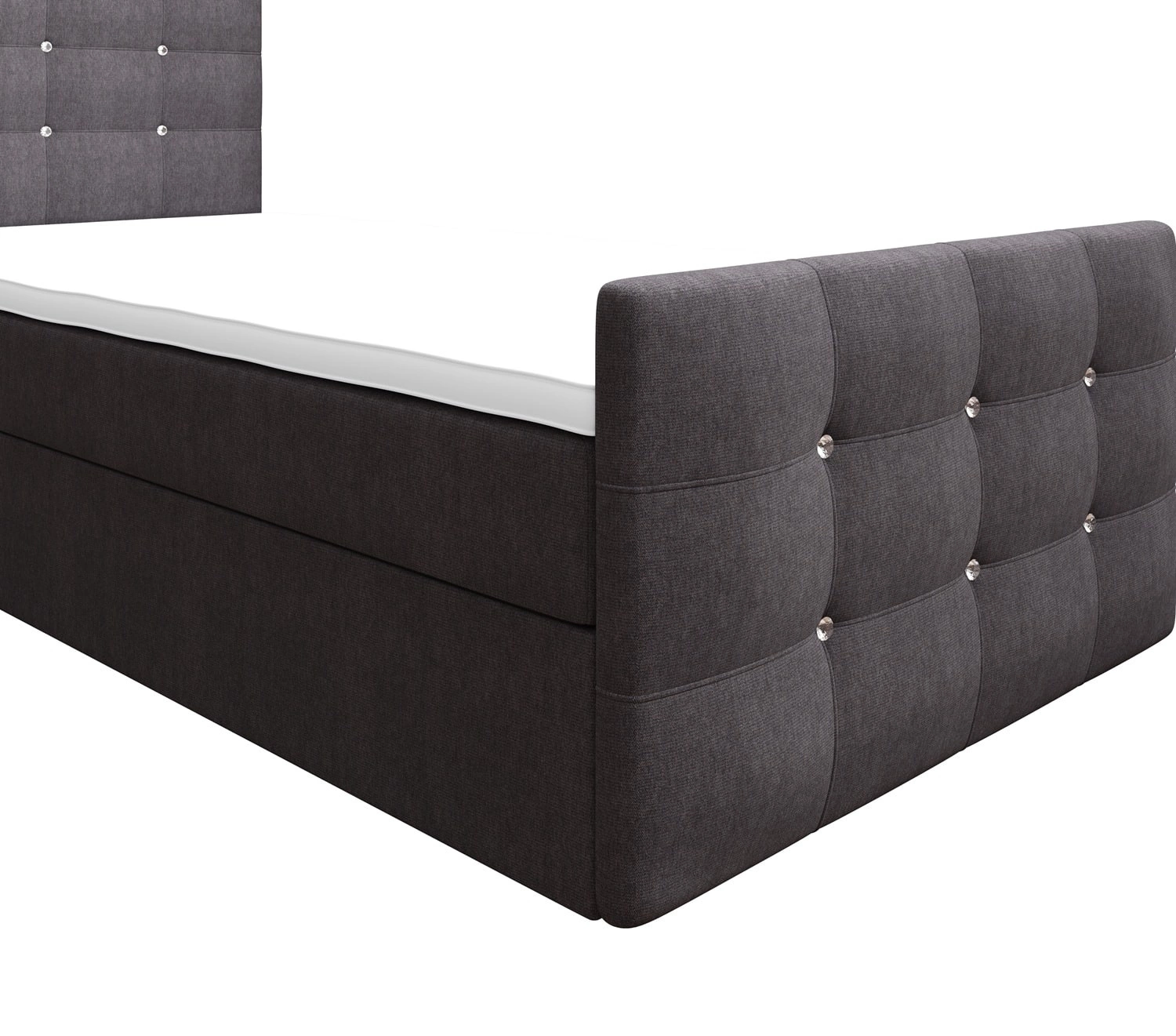 - Das kontinentale Bett Kansas ist die perfekte Wahl für ein Jugendzimmer oder ein kleineres Schlafzimmer. Das Design des Bettes bietet große Stabilität und Komfort bei der Benutzung. Die mit Kristallen besetzte Steppung an Kopf- und Fußteil ist ein echter