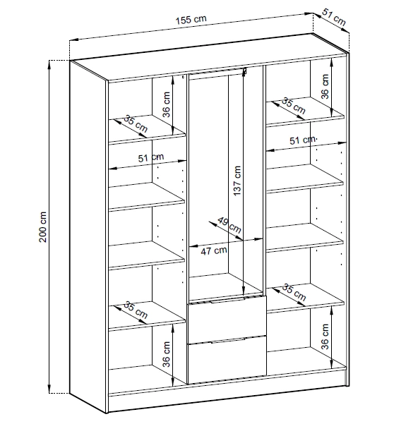Breite 155 cm, höhe 200 cm und Tiefe 51 cm die Garderobe passt in jede Art von Raum! Der Schrank garantiert komfortable und problemlose Nutzung und Langlebigkeit des gesamten Möbelstücks für viele Jahre der Nutzung. Die Möbel sind ideal für das Schlafzimmer, die Diele und das Wohnzimmer.