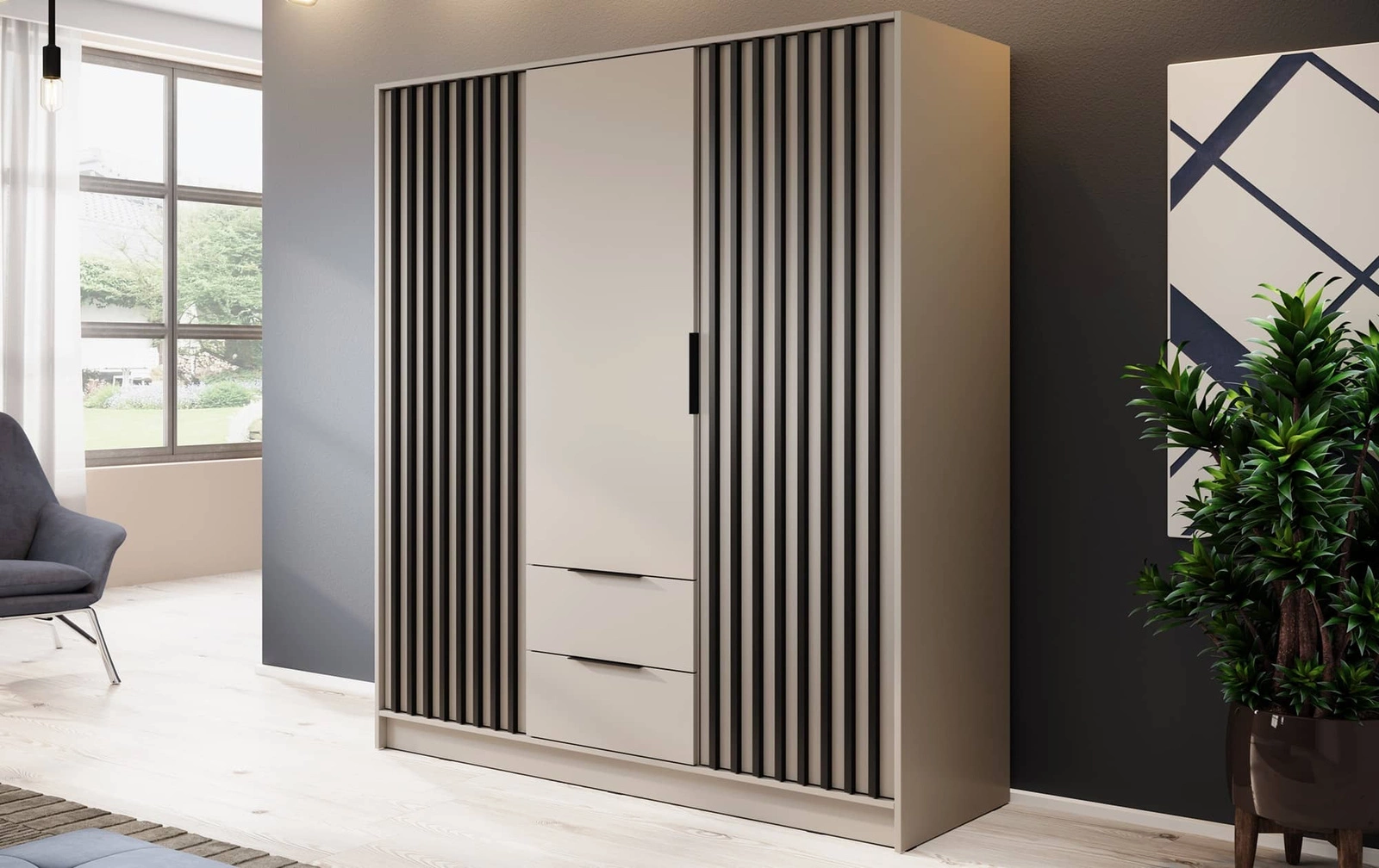Kleiderschrank Aspen 155 cm Beige / Schwarze Lamellen modernes Design Schranktüren mit dekorativen Lamellen