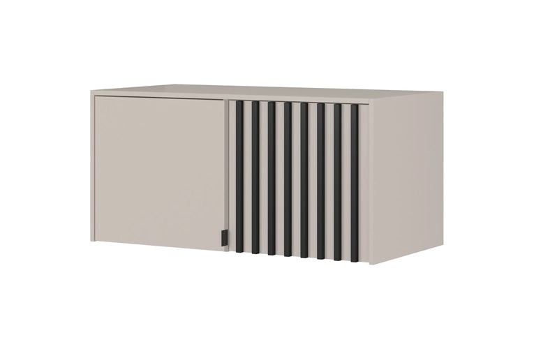 Die Schrankverlängerung hat flügeltüren mit einer matten Oberfläche matt. Die Möbel sind konstruiert aus 2 Türen. Die Platte ist aus hochwertigem laminierte Platte, die gekennzeichnet ist durch hoch widerstand gegen äußere Einflüsse wie Prellungen, Stöße und unglückliche Kratzer. Die Türen des Anbaus sind verziert mit lamellen in schwarz, die als Griff dienen.