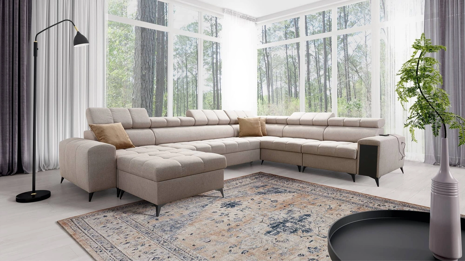 Die Abmessungen der Möbel ermöglichen platz in einem geräumigen Wohnzimmer oder Sitzungssaal zu schaffen. Breite der Ecke 359 cm, maximale Höhe 100 cm und Tiefe 276 cm. Die Liegefläche der Eckeinheit beträgt 127x284 cm. Die Sitzhöhe des Möbels beträgt 45 cm und die maximale Höhe der Rückenlehne beträgt 60 cm. Gewellte Federn und T30-Polyurethanschaum ist das Material, aus dem die Sitzfläche der Eckeinheit hergestellt ist. Rückendeckung mit verstellbaren Kopfstützen ermöglicht es Ihnen, den Winkel der Kopfstützen nach Ihren Wünschen einzustellen und garantiert Ihnen eine bequeme Erholung nach einem langen Tag, die Sie, Ihre Lieben und auch Ihre Gäste, die auf diesem einzigartigen Ecksofa sitzen, zu schätzen wissen werden.
