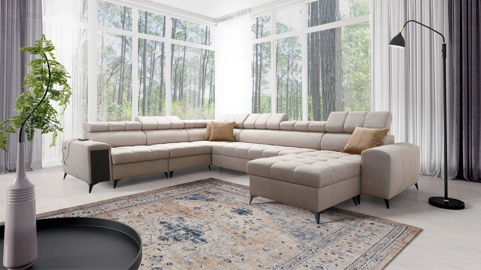 Bolmso Ecksofa VIII in Beige mit verstellbaren Kopfstützen ist ein reizvolles Möbelstück mit einer Garantie für höchsten Komfort und Funktionalität.