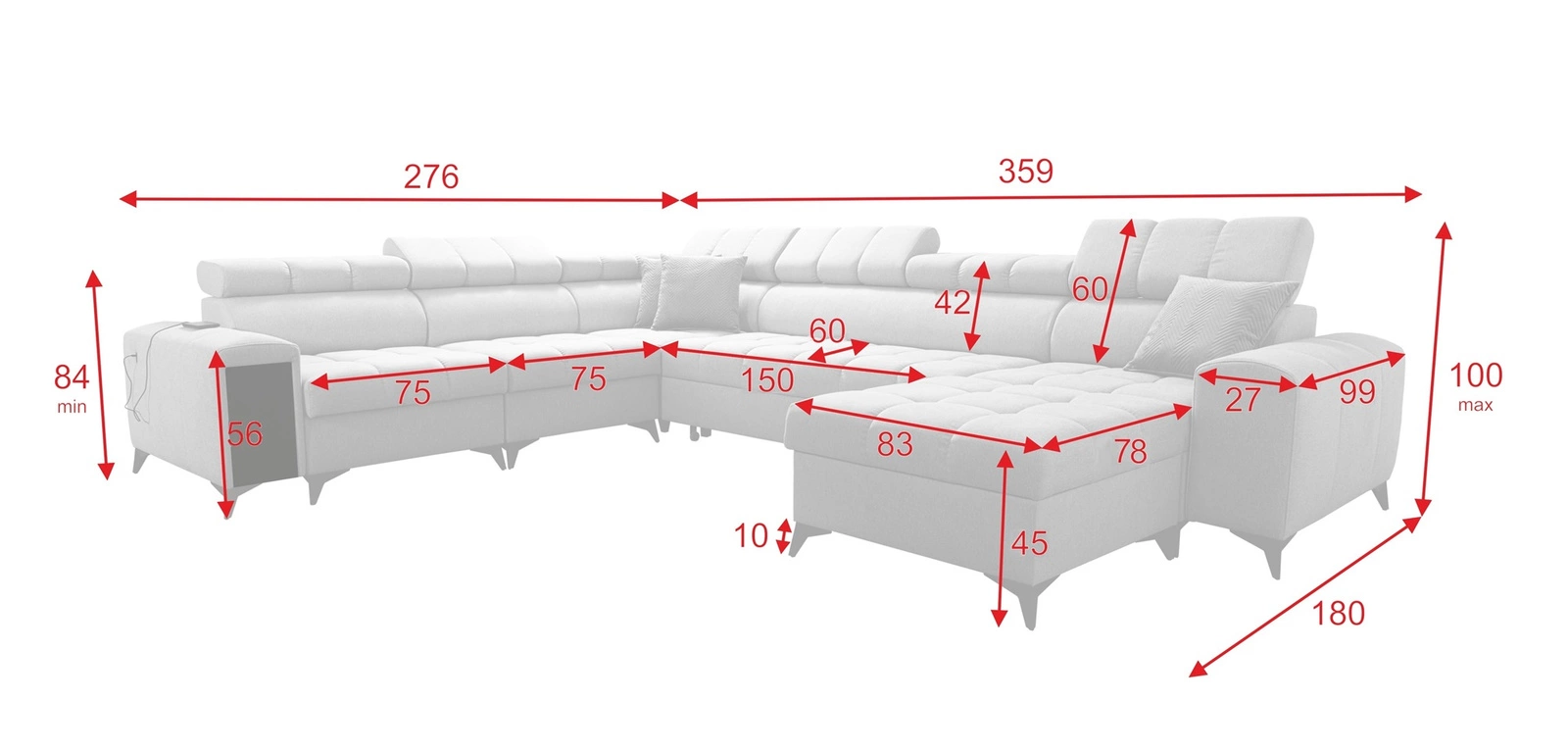 Die Abmessungen der Möbel ermöglichen platz in einem geräumigen Wohnzimmer oder Sitzungssaal zu schaffen. Breite der Ecke 359 cm, maximale Höhe 100 cm und Tiefe 276 cm. Die Liegefläche der Eckeinheit beträgt 127x284 cm. Die Sitzhöhe des Möbels beträgt 45 cm und die maximale Höhe der Rückenlehne beträgt 60 cm. Gewellte Federn und T30-Polyurethanschaum ist das Material, aus dem der Sitz der Ecke gefertigt ist. Rückendeckung mit verstellbaren Kopfstützen ermöglicht es Ihnen, den Winkel der Kopfstützen nach Ihren Wünschen einzustellen und garantiert Ihnen eine bequeme Erholung nach einem langen Tag, die Sie, Ihre Lieben und auch Ihre Gäste, die auf diesem einzigartigen Ecksofa sitzen, zu schätzen wissen werden.