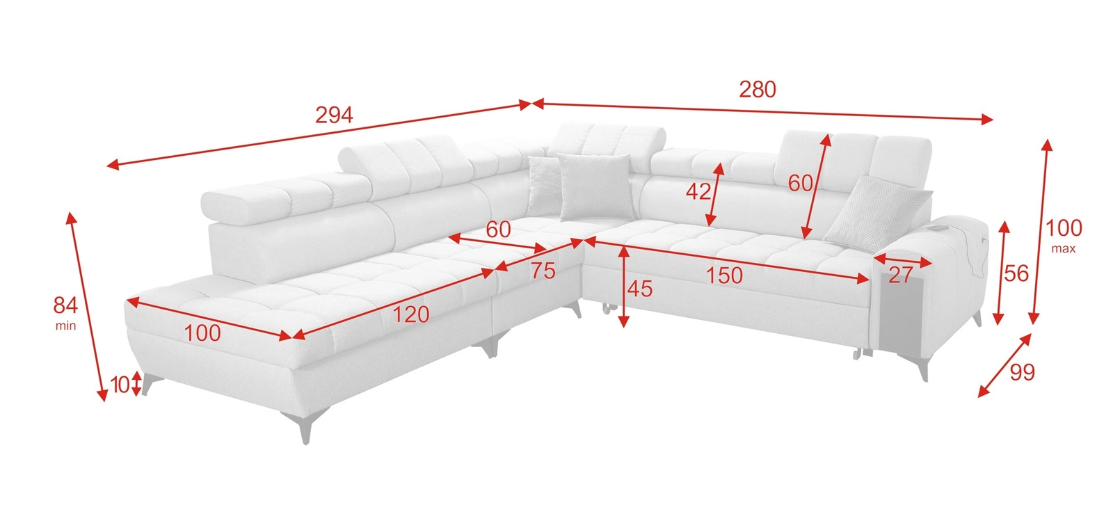Die Abmessungen der Möbel ermöglichen platz in einem geräumigen Wohnzimmer oder Sitzungssaal zu schaffen. Breite der Ecke 280 cm, maximale Höhe 100 cm und Tiefe 294 cm. Die Liegefläche der Eckeinheit beträgt 127x210 cm. Die Sitzhöhe des Möbels beträgt 45 cm und die maximale Höhe der Rückenlehne beträgt 60 cm. Gewellte Federn und T30-Polyurethanschaum ist das Material, aus dem der Sitz der Ecke hergestellt ist. Rückendeckung mit verstellbaren Kopfstützen ermöglicht es Ihnen, den Winkel der Kopfstützen nach Ihren Wünschen einzustellen und garantiert Ihnen eine bequeme Erholung nach einem langen Tag, die Sie, Ihre Lieben und auch Ihre Gäste, die auf diesem einzigartigen Ecksofa sitzen, zu schätzen wissen werden.
