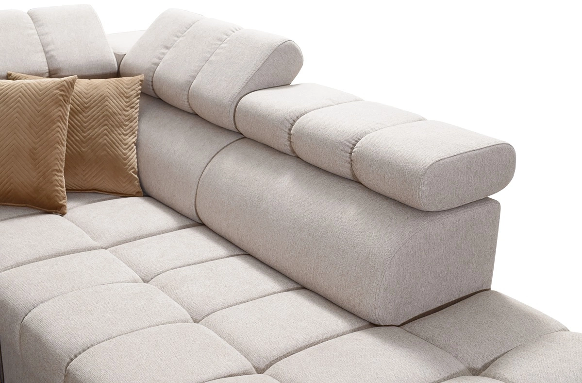 Die Abmessungen der Möbel ermöglichen platz in einem geräumigen Wohnzimmer oder Sitzungssaal zu schaffen. Breite der Ecke 280 cm, maximale Höhe 100 cm und Tiefe 294 cm. Die Liegefläche der Eckeinheit beträgt 127x210 cm. Die Sitzhöhe des Möbels beträgt 45 cm und die maximale Höhe der Rückenlehne beträgt 60 cm. Gewellte Federn und T30-Polyurethanschaum ist das Material, aus dem der Sitz der Ecke gefertigt ist. Rückendeckung mit verstellbaren Kopfstützen ermöglicht es Ihnen, den Winkel der Kopfstützen nach Ihren Wünschen einzustellen und garantiert Ihnen eine bequeme Erholung nach einem langen Tag, die Sie, Ihre Lieben und auch Ihre Gäste, die auf diesem einzigartigen Ecksofa sitzen, zu schätzen wissen werden.
