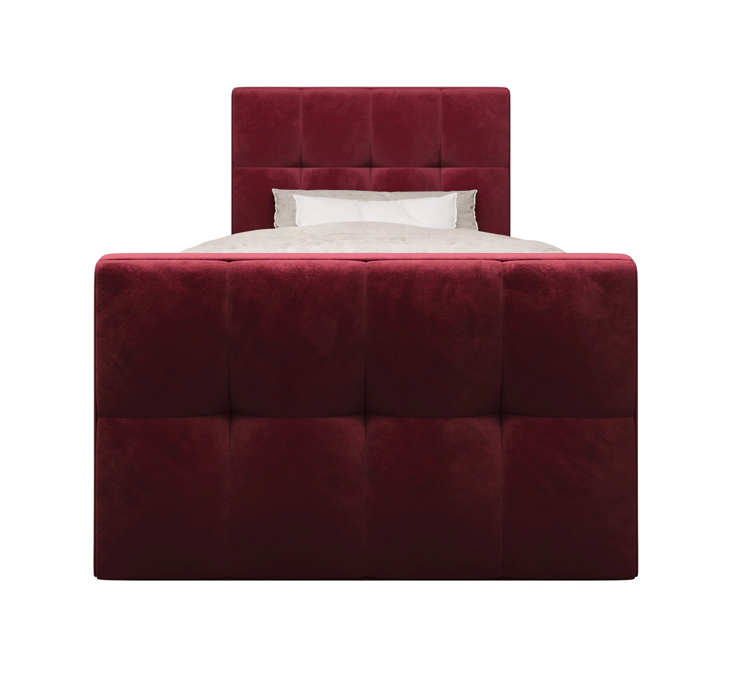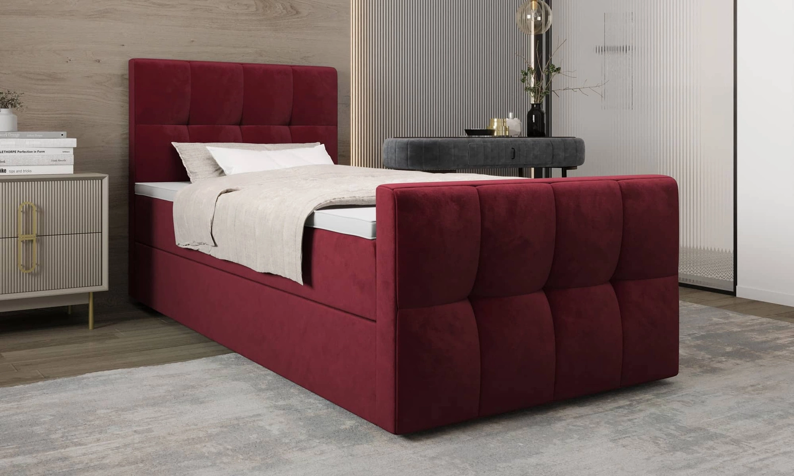 Boxspringbett Manhattan 90x200 dunkelrot Bett im modernen skandinavischen Stil mit gepolstertem Kopf- und Fußteil und Staukasten