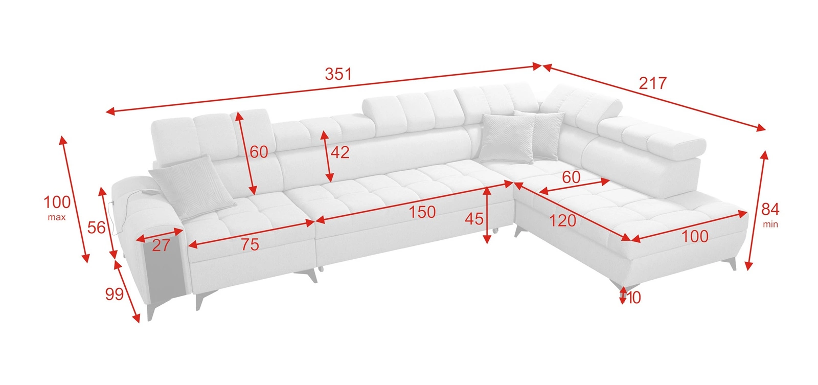 Die Abmessungen der Möbel ermöglichen platz in einem geräumigen Wohnzimmer oder Sitzungssaal zu schaffen. Breite der Ecke 351 cm, maximale Höhe 100 cm und Tiefe 217 cm. Die Liegefläche der Eckeinheit beträgt 127x210 cm. Die Sitzhöhe des Möbels beträgt 45 cm und die maximale Höhe der Rückenlehne beträgt 60 cm. Gewellte Federn und T30-Polyurethanschaum ist das Material, aus dem der Sitz der Ecke hergestellt ist. Rückendeckung mit verstellbaren Kopfstützen ermöglicht es Ihnen, den Winkel der Kopfstützen nach Ihren Wünschen einzustellen und garantiert Ihnen eine bequeme Erholung nach einem langen Tag, die Sie, Ihre Lieben und auch Ihre Gäste, die auf diesem einzigartigen Ecksofa sitzen, zu schätzen wissen werden.