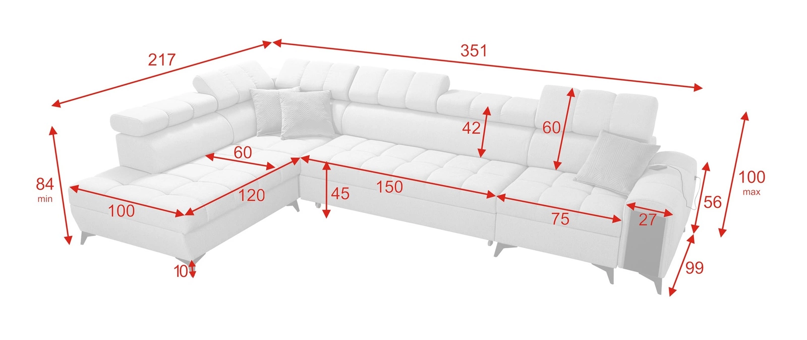 Die Abmessungen der Möbel ermöglichen platz in einem geräumigen Wohnzimmer oder Sitzungssaal zu schaffen. Breite der Ecke 351 cm, maximale Höhe 100 cm und Tiefe 217 cm. Die Liegefläche der Eckeinheit beträgt 127x210 cm. Die Sitzhöhe des Möbels beträgt 45 cm und die maximale Höhe der Rückenlehne beträgt 60 cm. Gewellte Federn und T30-Polyurethanschaum ist das Material, aus dem der Sitz der Ecke gefertigt ist. Rückendeckung mit verstellbaren Kopfstützen ermöglicht es Ihnen, den Winkel der Kopfstützen nach Ihren Wünschen einzustellen und garantiert Ihnen eine bequeme Erholung nach einem langen Tag, die Sie, Ihre Lieben und auch Ihre Gäste, die auf diesem einzigartigen Ecksofa sitzen, zu schätzen wissen werden.