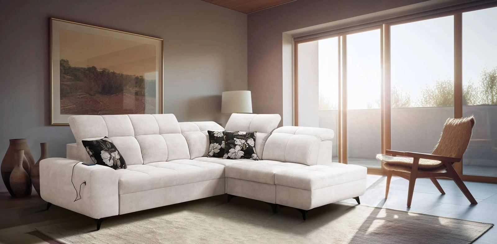 Die Extras dieses Möbels, die alle Benutzer schätzen werden, sind die zwei Bettkästen, die verstellbaren Kopfstützen und die USB-Ladebuchse an der Seite des Eckmöbels.