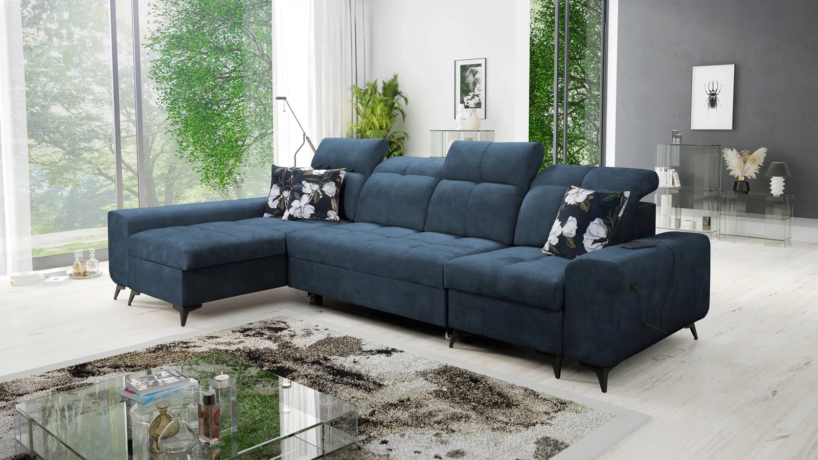 Ecksofa mit Schlaffunktion Buffalo XII blau linke Seite stilvolles und funktionelles Ecksofa mit Bettzeugcontainer