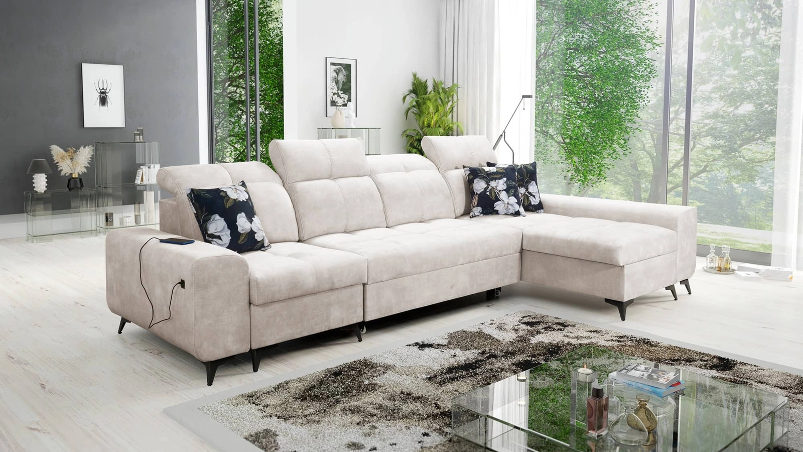 Die Extras dieses Möbels, die alle Benutzer schätzen werden, sind der Bettzeugbehälter, die verstellbaren Kopfstützen und die USB-Ladebuchse an der Seite des Eckmöbels.