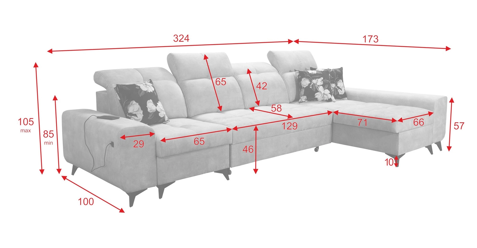 Die Abmessungen der Möbel ermöglichen füllung eines geräumigen Wohnzimmers oder Sitzungssaals. Breite der Ecke 324 cm, maximale Höhe 105 cm und Tiefe 173 cm. Die Liegefläche der Eckeinheit beträgt 129x199 cm. Die Sitzhöhe des Möbels beträgt 46 cm und die maximale Höhe der Rückenlehne beträgt 65 cm. Gewellte Federn und T30-Polyurethanschaum ist das Material, aus dem der Sitz der Ecke hergestellt ist. Feste Rückenlehne mit verstellbaren Kopfstützen ermöglicht eine einfache anpassung sie können die Neigung der Kopfstützen nach Ihren Wünschen einstellen und so für eine bequeme Erholung nach einem langen Tag sorgen, die Sie, Ihre Lieben und auch Ihre Gäste, die auf diesem einzigartigen Ecksofa Platz nehmen, zu schätzen wissen werden.