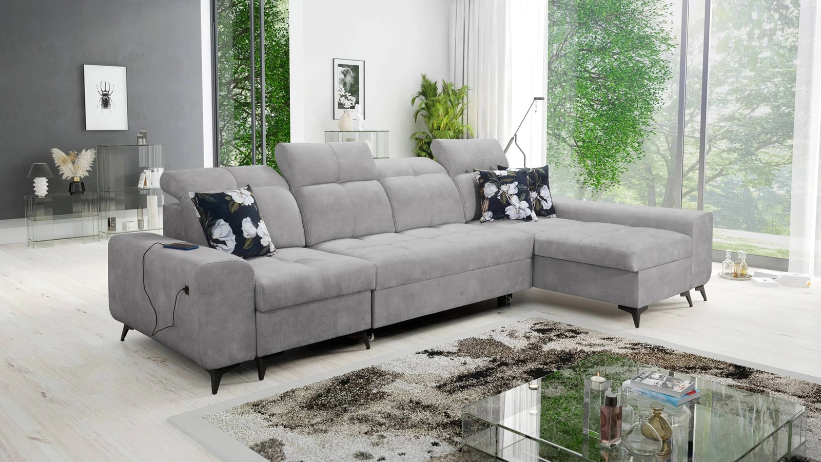 Die Extras dieses Möbels, die alle Benutzer schätzen werden, sind der Bettzeugbehälter, die verstellbaren Kopfstützen und die USB-Ladebuchse an der Seite des Eckmöbels.