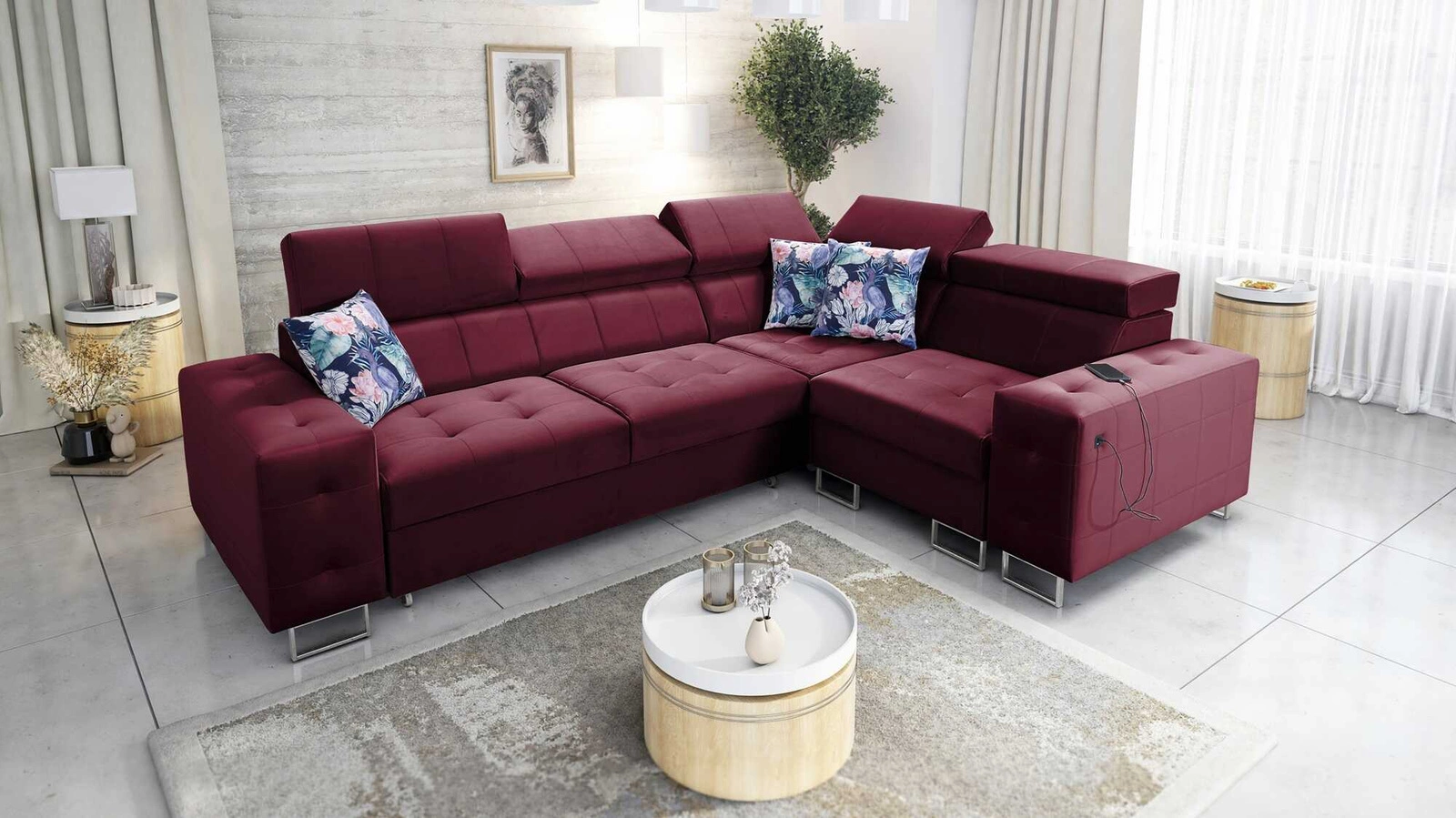 Hampton Ecksofa II in Burgunderrot mit verstellbaren Kopfstützen ist ein elegantes Möbelstück, das sich perfekt in jede Einrichtung Ihres Hauses einfügt.