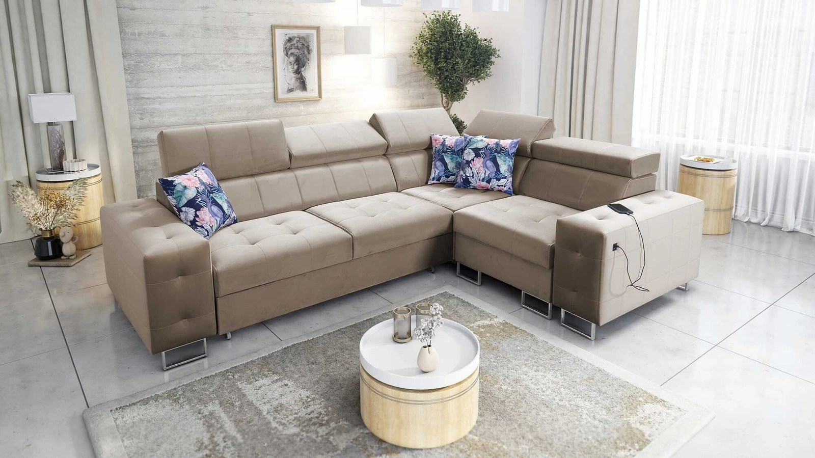 Ecksofa mit Schlaffunktion Hampton II beige rechte Seite stilvolles Ecksofa Bett weiche Polsterung Stoffart Samt