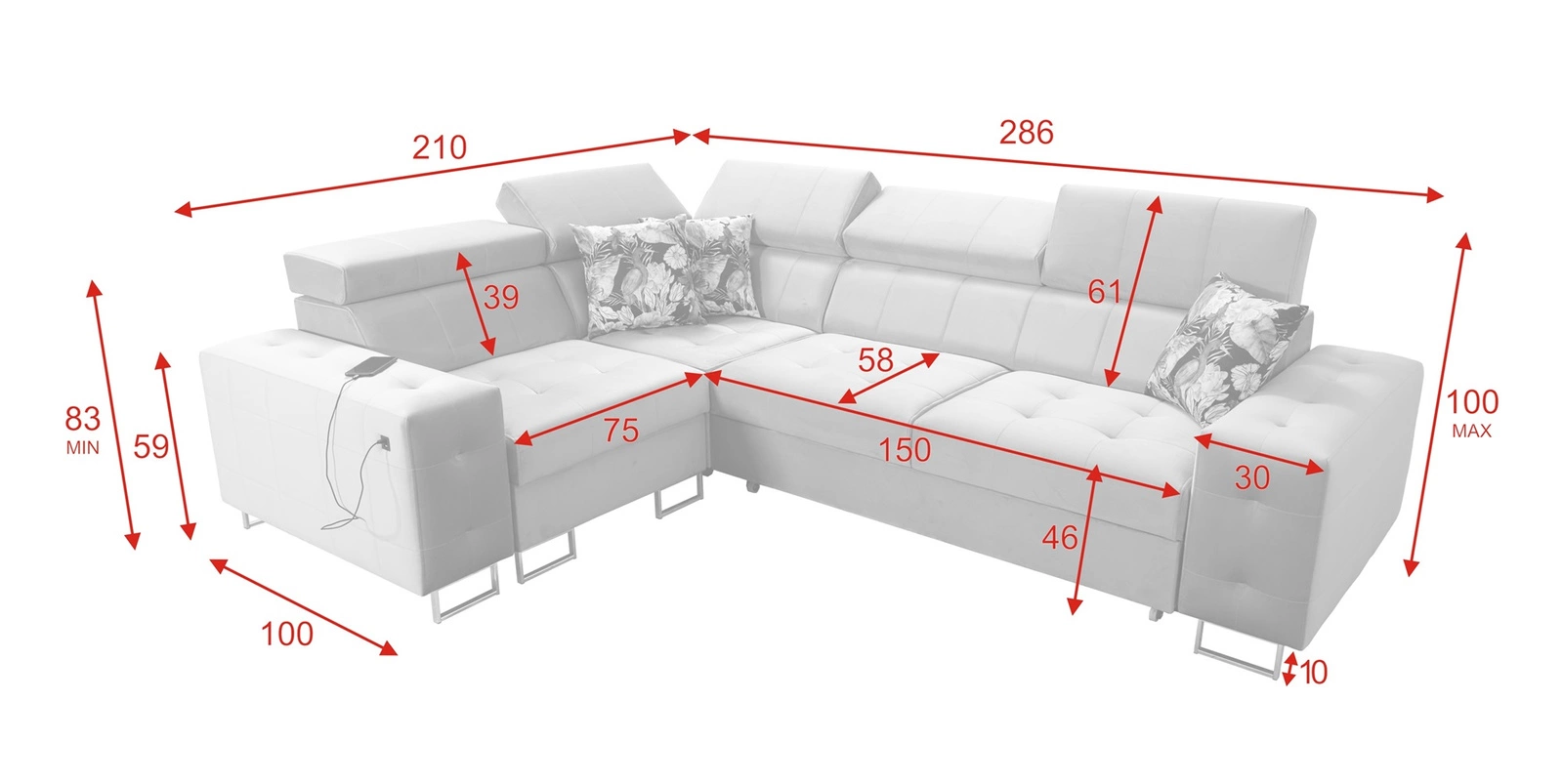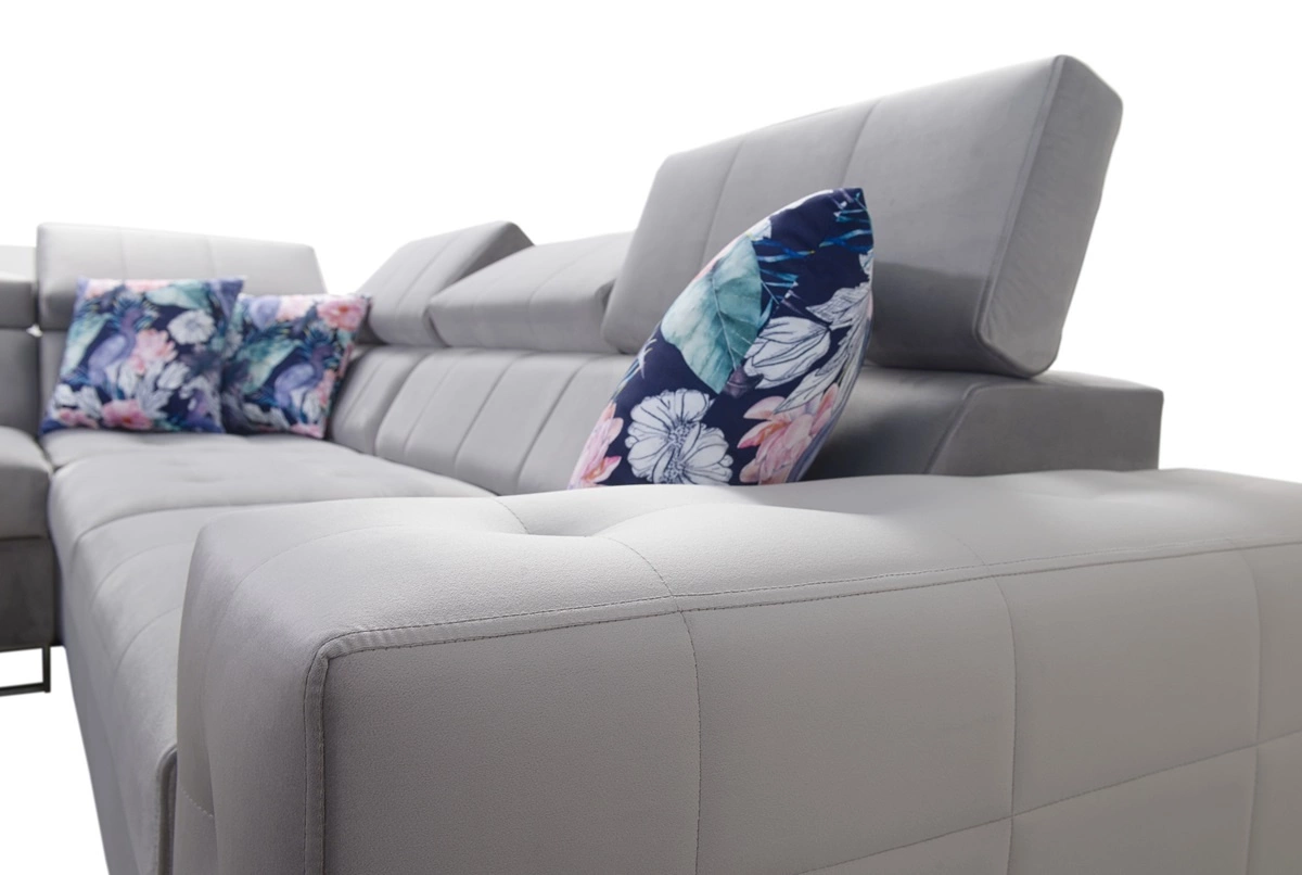 Abmessungen der Möbel ermöglichen platz in einem geräumigen Wohnzimmer oder Sitzungssaal zu schaffen. Breite der Ecke 286 cm, maximale Höhe 100 cm und Tiefe 210 cm. Die Liegefläche der Eckeinheit beträgt 127x210 cm. Die Sitzhöhe des Möbels beträgt 46 cm und die maximale Höhe der Rückenlehne beträgt 61 cm. Gewellte Federn und T30-Polyurethanschaum ist das Material, aus dem der Sitz der Ecke hergestellt ist. Rückendeckung mit verstellbaren Kopfstützen ermöglicht es Ihnen, den Winkel der Kopfstützen nach Ihren Wünschen einzustellen und garantiert Ihnen eine bequeme Erholung nach einem langen Tag, die Sie, Ihre Lieben und auch Ihre Gäste, die auf diesem einzigartigen Ecksofa sitzen, zu schätzen wissen werden.