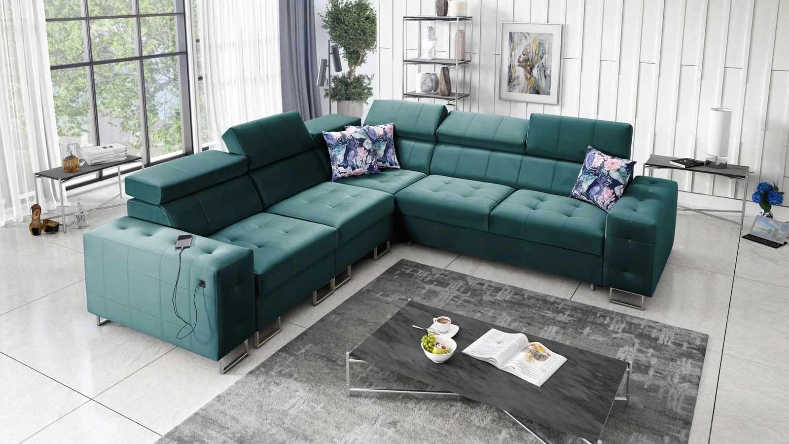 Ecksofa mit Schlaffunktion Hampton III sea links komfortables Ecksofa aus glattem und weichem Samtstoff