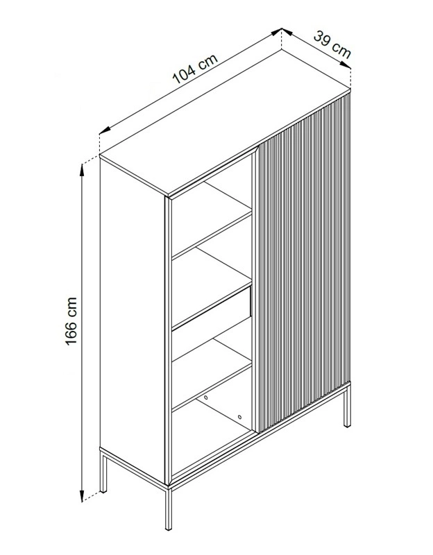 Die geriffelten Fronten sind aus 18 mm dickes MDF. Gehäuse aus hochwertiger laminierter Karton, die resistent gegen äußere Einflüsse wie Druckstellen, Stöße und unglückliche Kratzer ist. Die verglaste Front der Vitrine besteht aus einscheibensicherheitsglas in einem dunklen Farbton. Die Vitrine ist mit einem diskreten beleuchtung LED, es verleiht dem Design optische Leichtigkeit und Funktionalität. Die Struktur der Möbel wurde mit geschmackvollen goldfarbene Metallbeine.