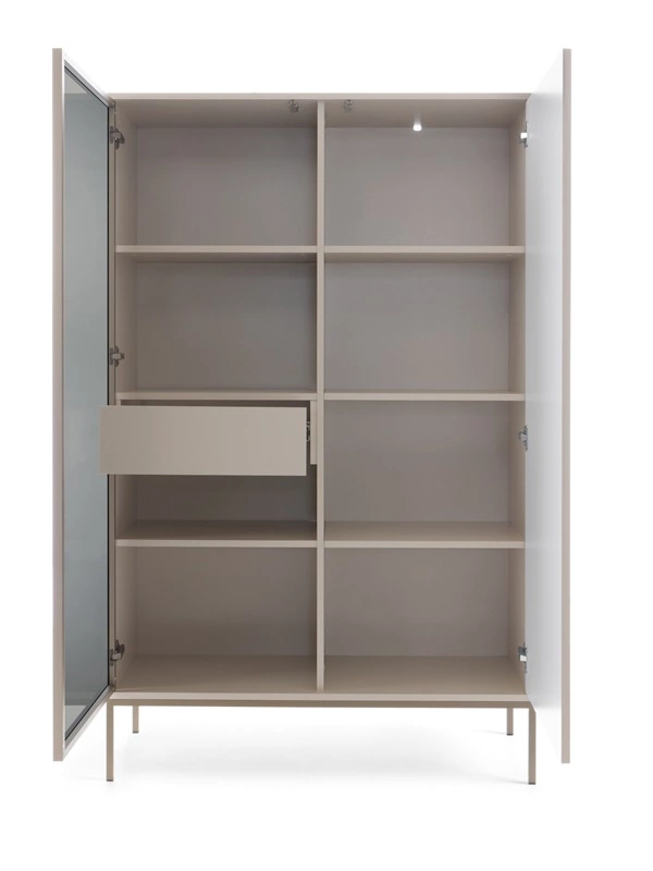Die Website ist aufgebaut aus 2 Türen. Für die Öffnung der Vitrinentür wurde Folgendes verwendet griffloses Push-to-Open-System. Das verwendete System erhöht den Komfort und die Sicherheit der Möbel. Die Website ist unterteilt in in acht Abschnitte mit Regalen. Im Inneren des Schrankes befinden sich außerdem schublade mit Vollauszugsystem. Moderne Vitrinen für das Wohnzimmer garantie störungsfreie Nutzung und Langlebigkeit des gesamten Möbelstücks für viele Jahre der Nutzung. Modische Kombination von Beige in einem Kaschmir-Ton mit einer goldenen Basis mischt sich gut mit anderen Farben, so dass die die Glasvitrinen aus der Amma-Kollektion eignen sich perfekt als Vitrine für das Wohnzimmer, als Vitrine für das Esszimmer oder als Vitrine für den bücher.