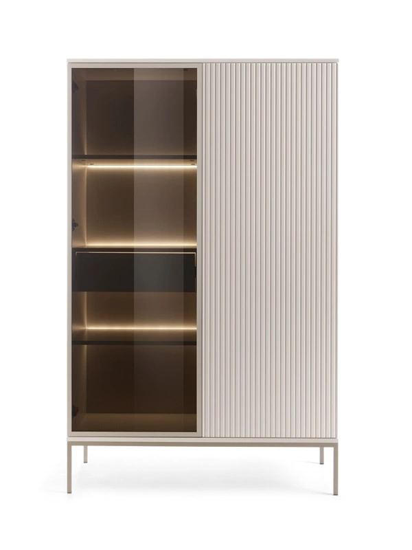 Amma-Möbel ist eine einzigartige Kombination aus geometrischen formulare, subtile Farben und interessantes Design. Das Vorhandensein der Schrankwand wird den Raum stilvoll abrunden und ihm eine moderne und einzigartige Atmosphäre verleihen. Modisch kombination aus geriffelten Fronten mit einer trendigen beigen Farbgebung in einem Kaschmir-Ton verleiht Möbeln ein originelles und ästhetisch ansprechendes Aussehen. Verglaste Fronten hängeelemente sind Elemente, die ins Auge fallen und einen besonderen Charakter verleihen. Das einzigartige Design des Amma-Möbelsets bewährt sich auch in der das anspruchsvollste Interieur.