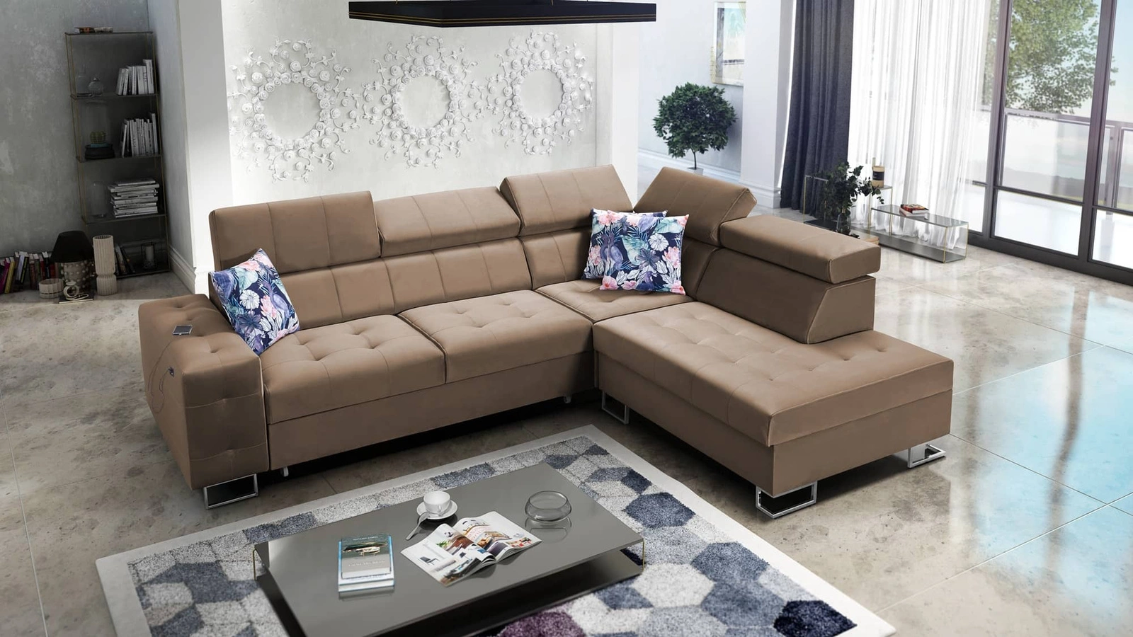 Ecksofa mit Schlaffunktion Hampton VII hellbraunes rechtes Ecksofa für den Raum aus Samtstoff mit glatter Oberfläche
