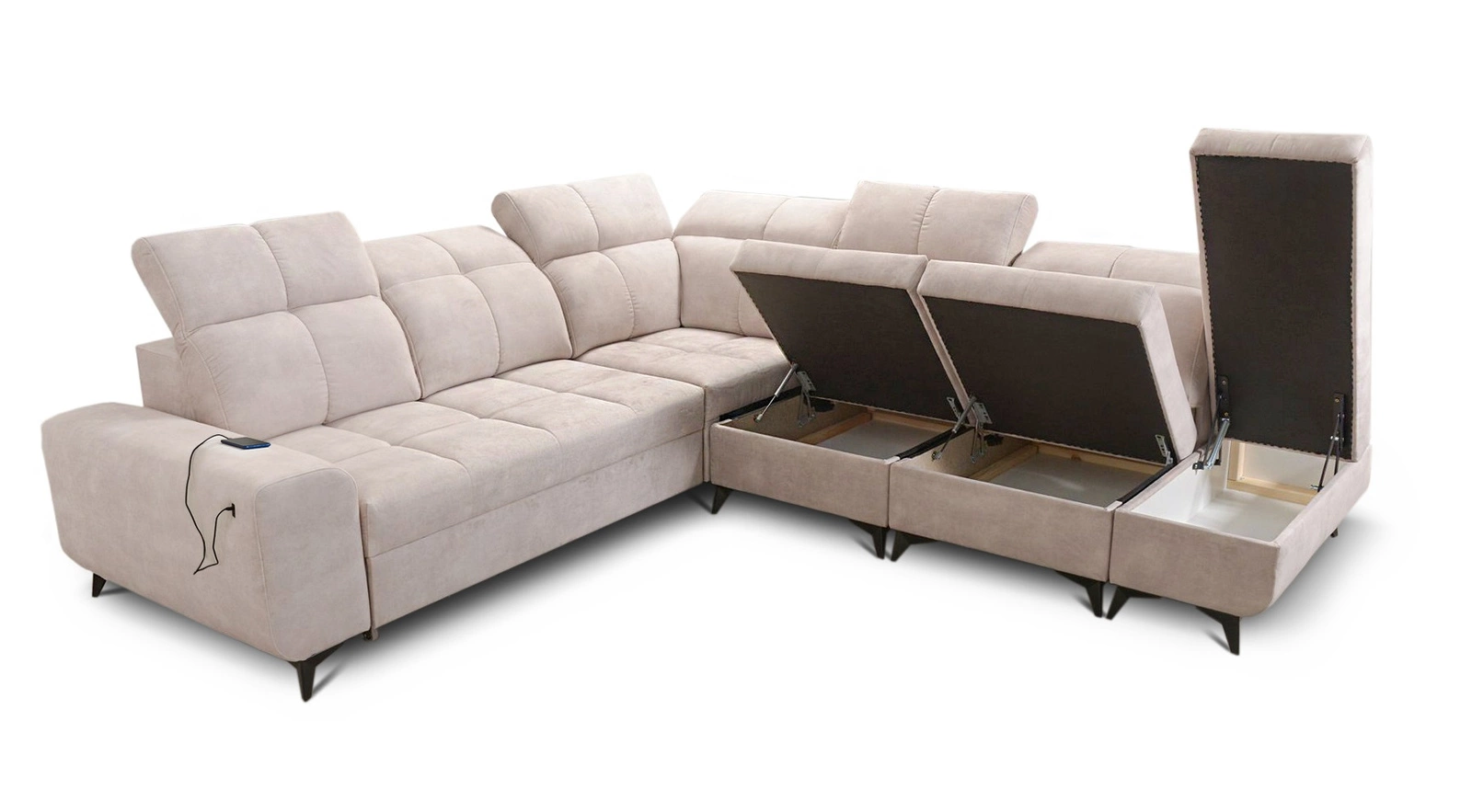 Die Extras dieses Möbels, die alle Benutzer schätzen werden, sind die drei Bettkästen, die verstellbaren Kopfstützen und die USB-Ladebuchse an der Seite des Eckmöbels.