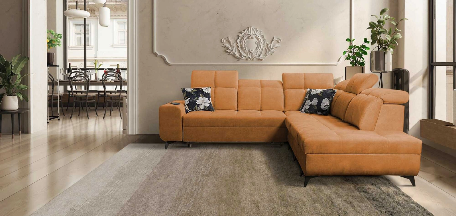 Ecksofa mit Schlaffunktion Buffalo IX Honig rechte Seite stilvolles Ecksofa für Zimmer aus Veloursstoff dekorative Kissen