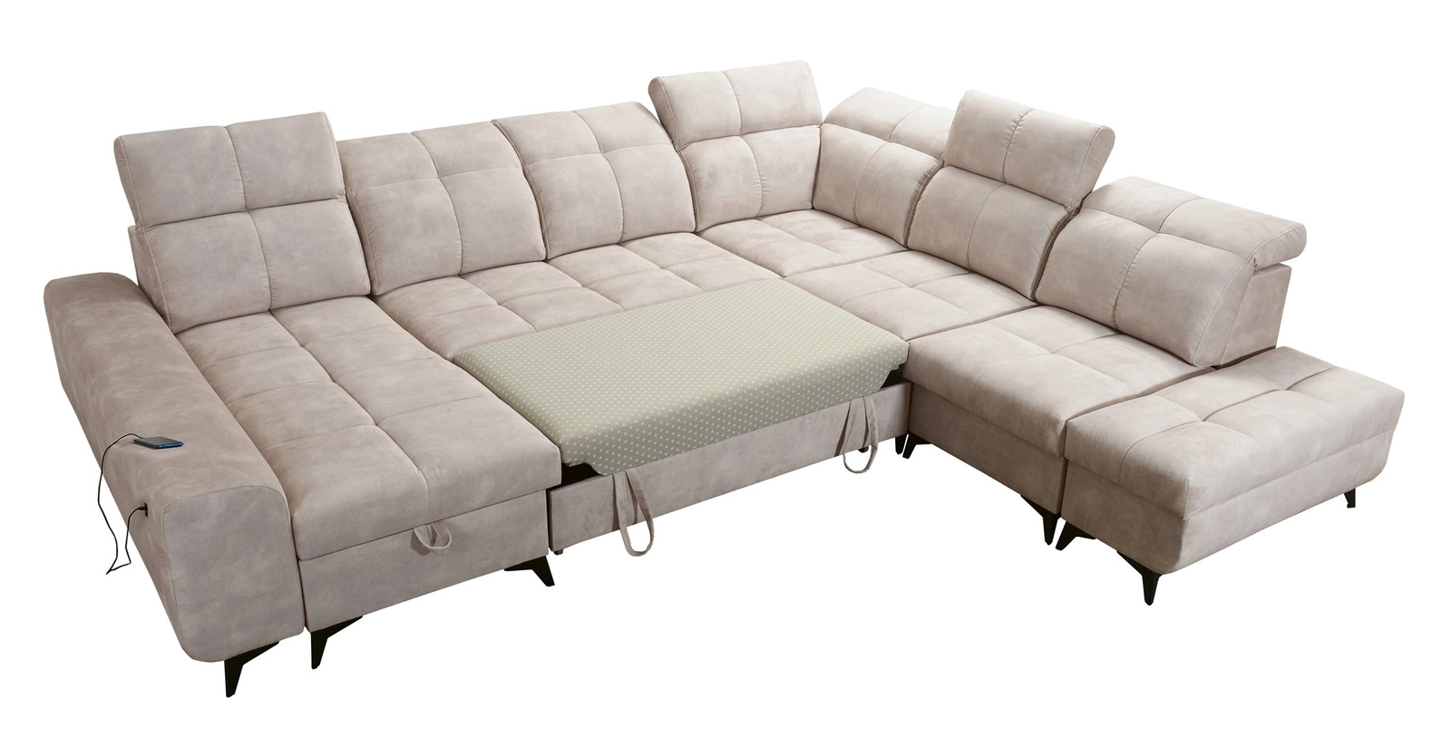 Zu den Extras dieses Möbels, die von allen Nutzern geschätzt werden, gehören bis zu sieben verstellbare Kopfstützen, vier Bettzeugbehälter und eine USB-Ladebuchse in der Seite des Eckmöbels.