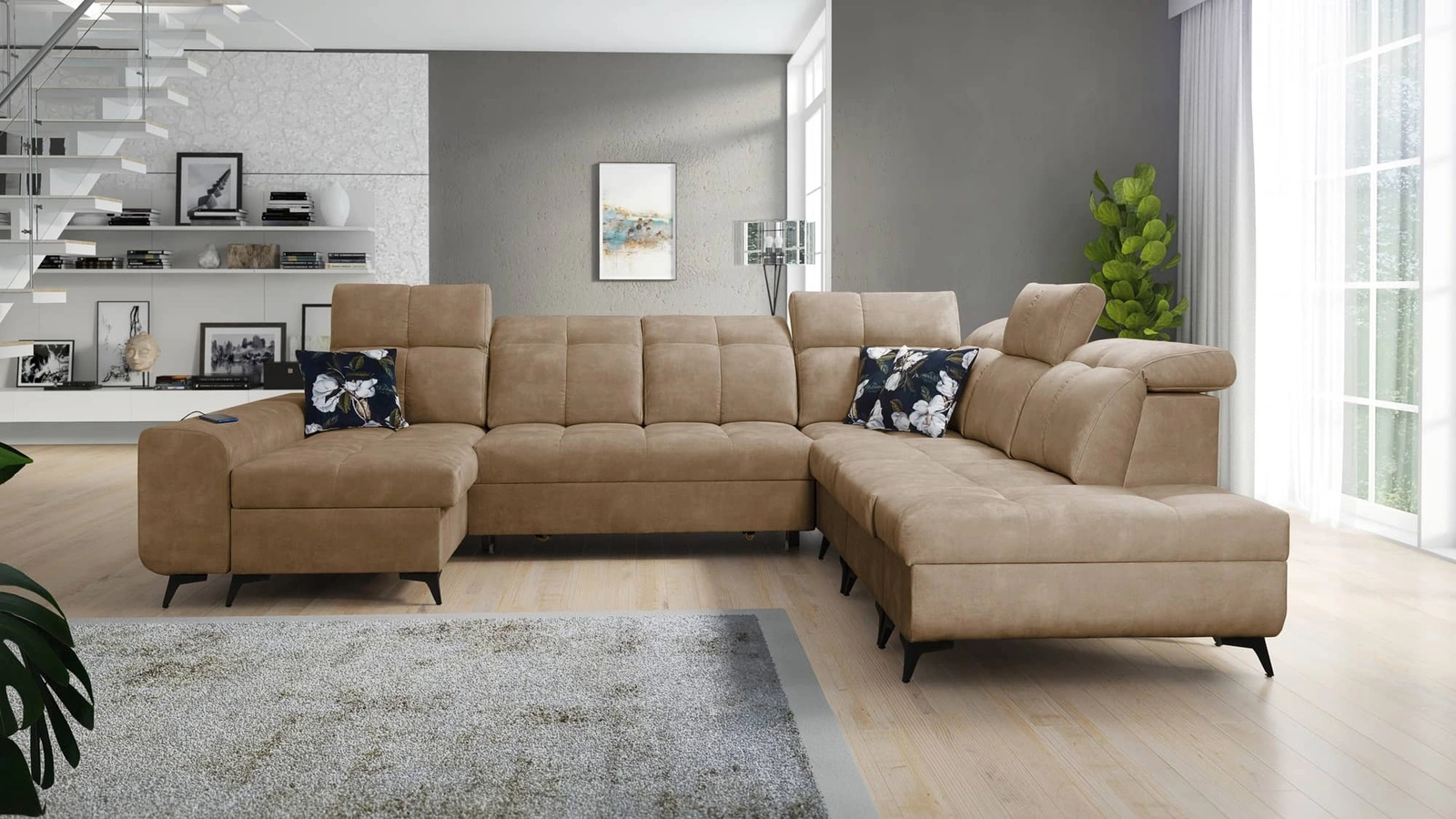 Buffalo X Ecksofa in dunklem Beige mit verstellbaren Kopfstützen ist ein interessant aussehendes Möbelstück mit einer eleganten Ausführung.