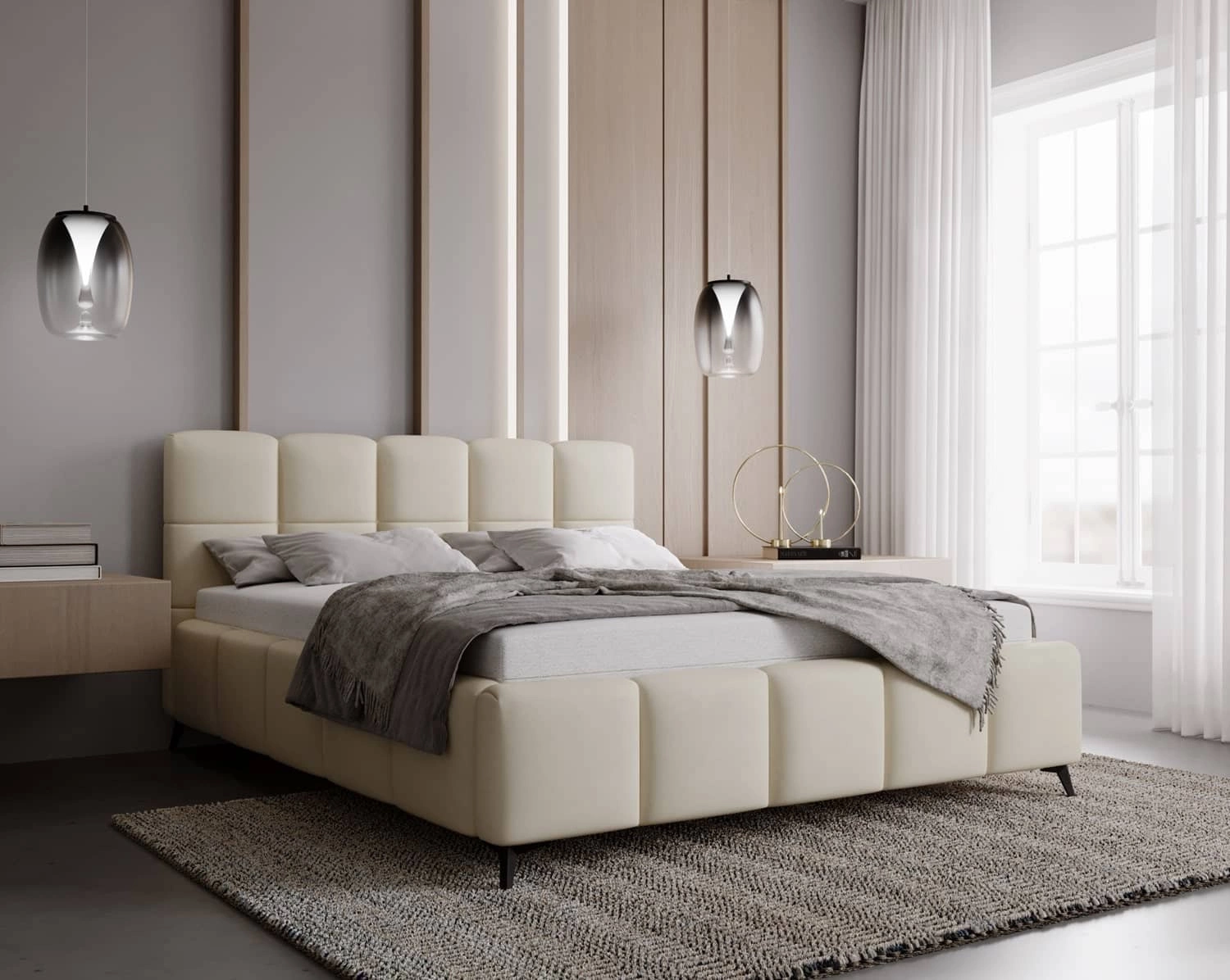 Bett aus Stoff typ samt Amor Samt 4323 garantiert höchsten Komfort und Funktionalität für die tägliche Entspannung im Schlafzimmer. Der Stoff hat eine Beschichtung aus hydrophob, was eine begrenzte Flüssigkeitsaufnahme gewährleistet. Der Stoff weist außerdem eine hohe Widerstandsfähigkeit gegen Ausbleichen die ideal für sehr sonnige Inneneinrichtungen ist. Äußerst weich, glatt der Bezugsstoff Amor Velvet zeichnet sich durch seine angenehme und samtige Oberfläche aus. Dank der Eigenschaften des verwendeten Stoffes behält das Bett lange Zeit sein ursprüngliches Aussehen. Das Design des Bettes bietet große Stabilität und Komfort bei der Benutzung. Der Bettrahmen ist aus Holz und Möbelplatte gefertigt. Nähte an das Kopfteil und der Bettrahmen ziehen die Blicke auf sich und verleihen dem Bett einen besonderen Charakter.