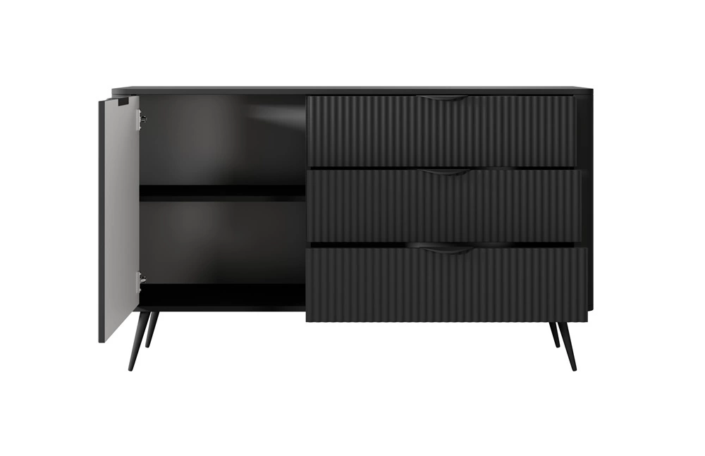 Geriffelte Fronten wurden hergestellt aus mDF. Der Korpus der Kommode ist gefertigt aus hochwertige 16 mm dicke laminierte Platte, die resistent gegen äußere Einflüsse wie Druckstellen, Stöße und unglückliche Kratzer ist. Die Struktur der Möbel wurde variiert mit schwarz metallbeine. Präzise Verarbeitung und Liebe zum Detail dafür sorgen, dass die Kommode viele Jahre lang ihr schönes Aussehen behält, ohne an Funktionalität zu verlieren.