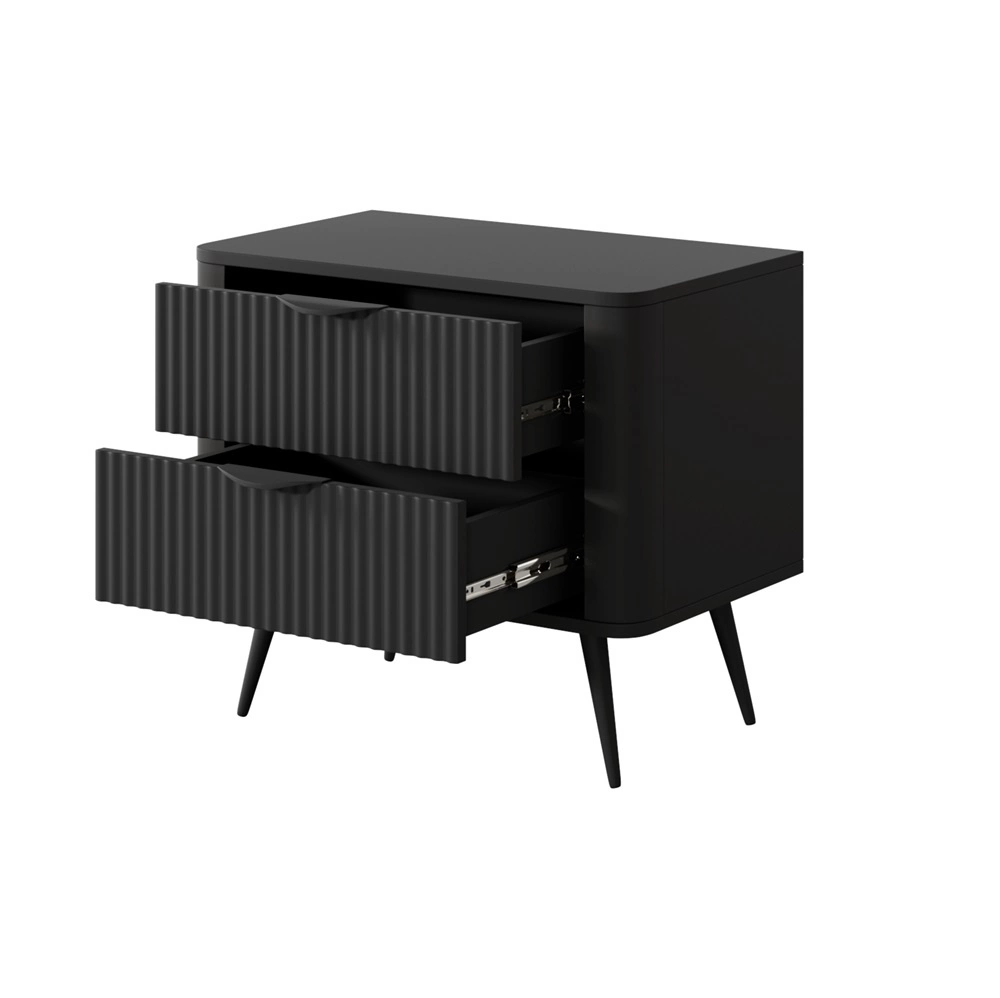 Nachttisch mit Schubladen Lante ist ein reizvolles Möbelstück mit einem besonderen und einzigartigen Charakter. Eine ungewöhnliche Kombination klassisch schwarz mit einer ovalen Körperform macht den gesamten Look dezent und sehr stilvoll. Geriffelte Fronten und randklammern verleihen Finesse und Eleganz und sind zudem eine auffällige Dekoration. Geräumige Schubladen stauraum für all Ihre Habseligkeiten und wichtigen Accessoires. Das einzigartige Design des Nachttischs funktioniert auch im das anspruchsvollste Interieur.