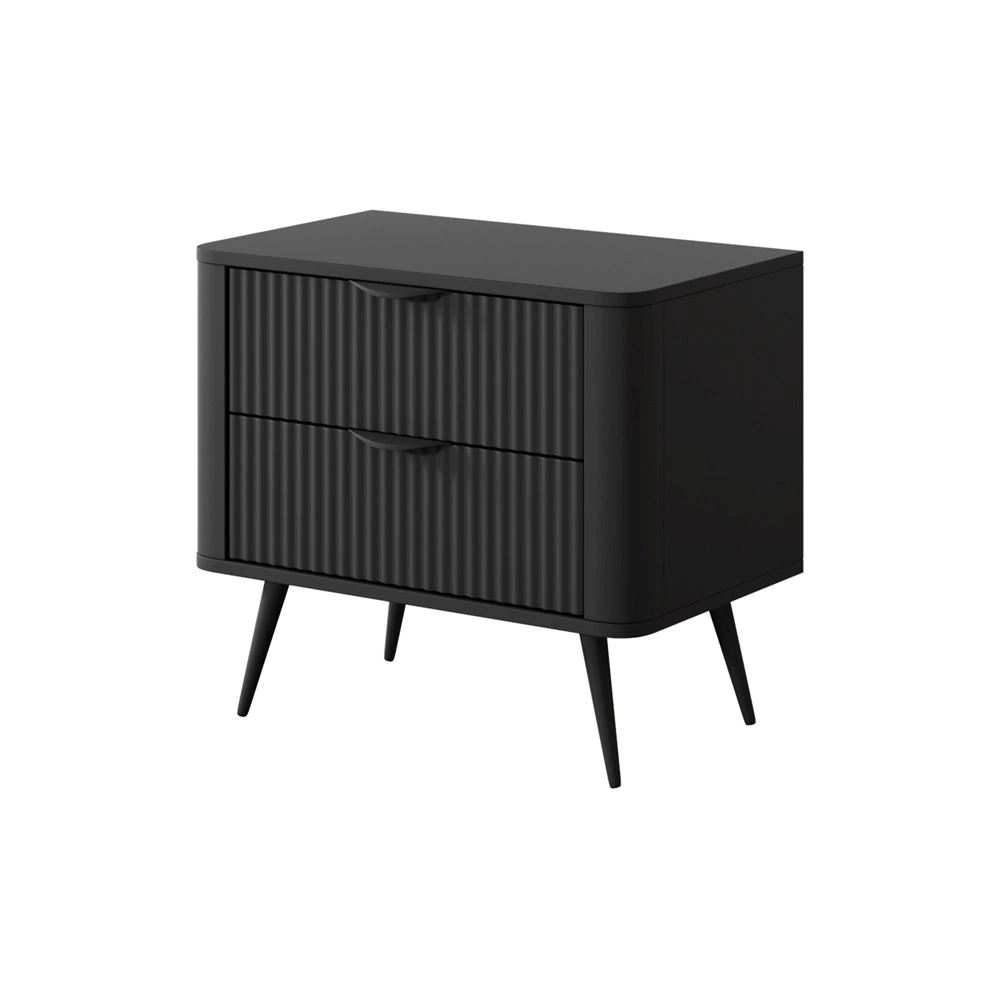 Geriffelte Fronten wurden hergestellt aus mDF. Der Korpus des Nachttischs ist gefertigt aus hochwertige 16 mm dicke laminierte Platte, die resistent gegen äußere Einflüsse wie Druckstellen, Stöße und unglückliche Kratzer ist. Die Struktur der Möbel wurde variiert mit schwarz metallbeine. Präzise Verarbeitung und Liebe zum Detail dafür sorgen, dass der Nachttisch viele Jahre lang sein schönes Aussehen behält, ohne an Funktionalität zu verlieren.