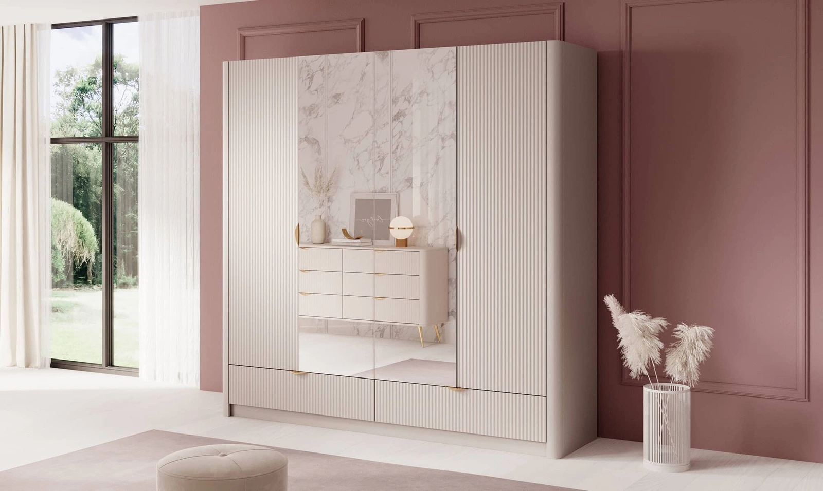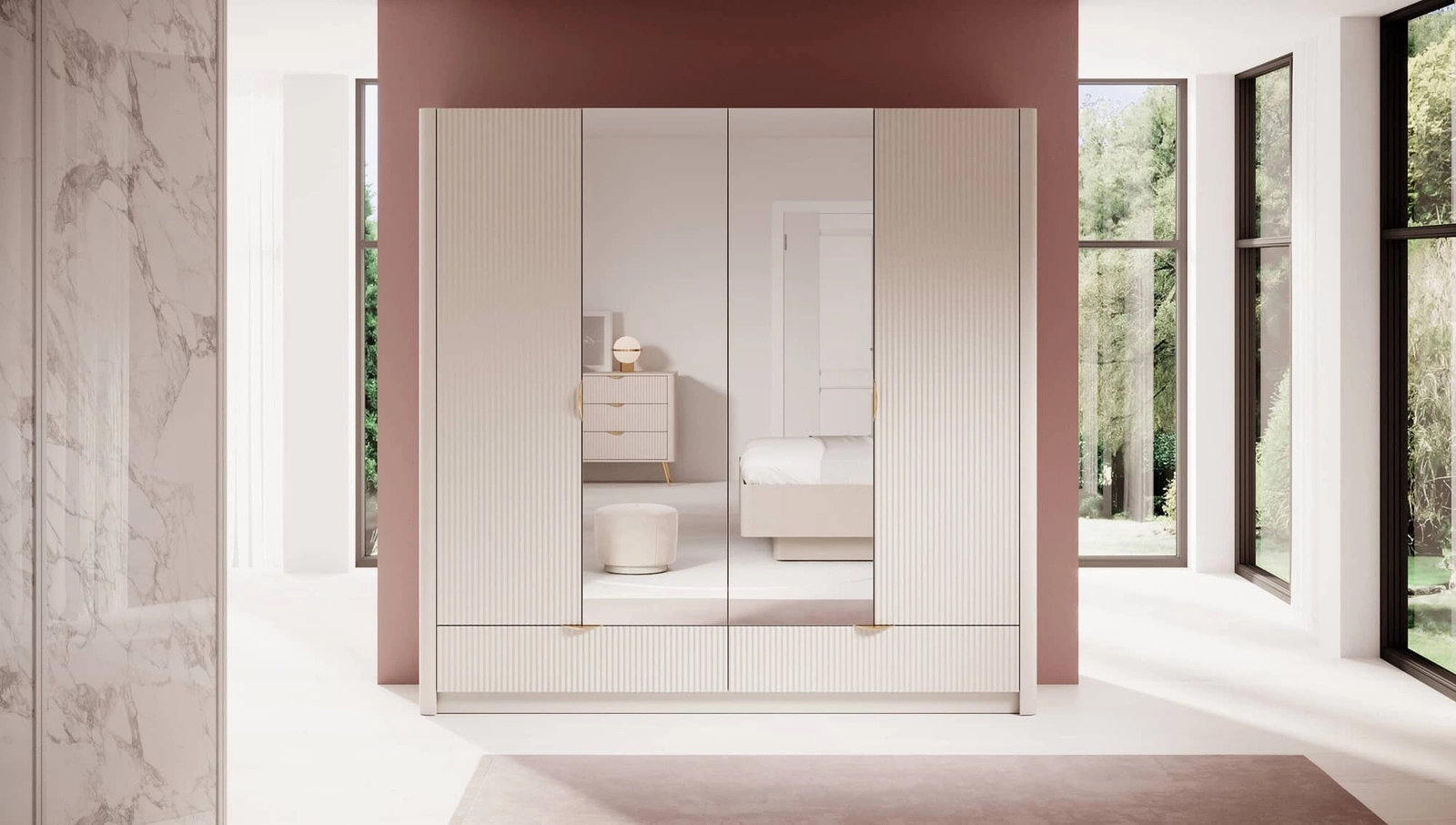 Spiegelschrank Lante 213 cm beige stilvoller Kleiderschrank mit Schubladen in modernem Design geriffelte Fronten originelle geschwungene Form