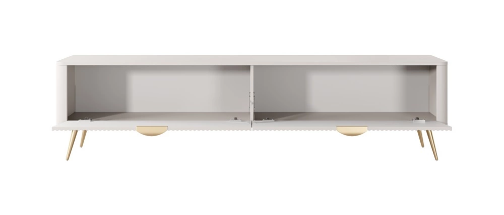 Geriffelte Fronten wurden hergestellt aus mDF. Das Gehäuse des RTV-Schrankes besteht aus hochwertige 16 mm dicke laminierte Platte, die resistent gegen äußere Einflüsse wie Druckstellen, Stöße und unglückliche Kratzer ist. Die Struktur des Mobiliars wurde mit Gold verziert mit Gold metallbeine. Präzise Verarbeitung und Liebe zum Detail dafür sorgen, dass der TV-Schrank über viele Jahre hinweg sein schönes Aussehen behält, ohne an Funktionalität zu verlieren.