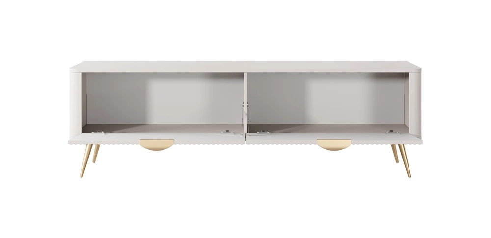 Geriffelte Fronten wurden hergestellt aus mDF. Das Gehäuse des RTV-Schrankes besteht aus hochwertige 16 mm dicke laminierte Platte, die resistent gegen äußere Einflüsse wie Druckstellen, Stöße und unglückliche Kratzer ist. Die Struktur des Mobiliars wurde mit Gold verziert mit Gold metallbeine. Präzise Verarbeitung und Liebe zum Detail dafür sorgen, dass der TV-Schrank über viele Jahre hinweg sein schönes Aussehen behält, ohne an Funktionalität zu verlieren.