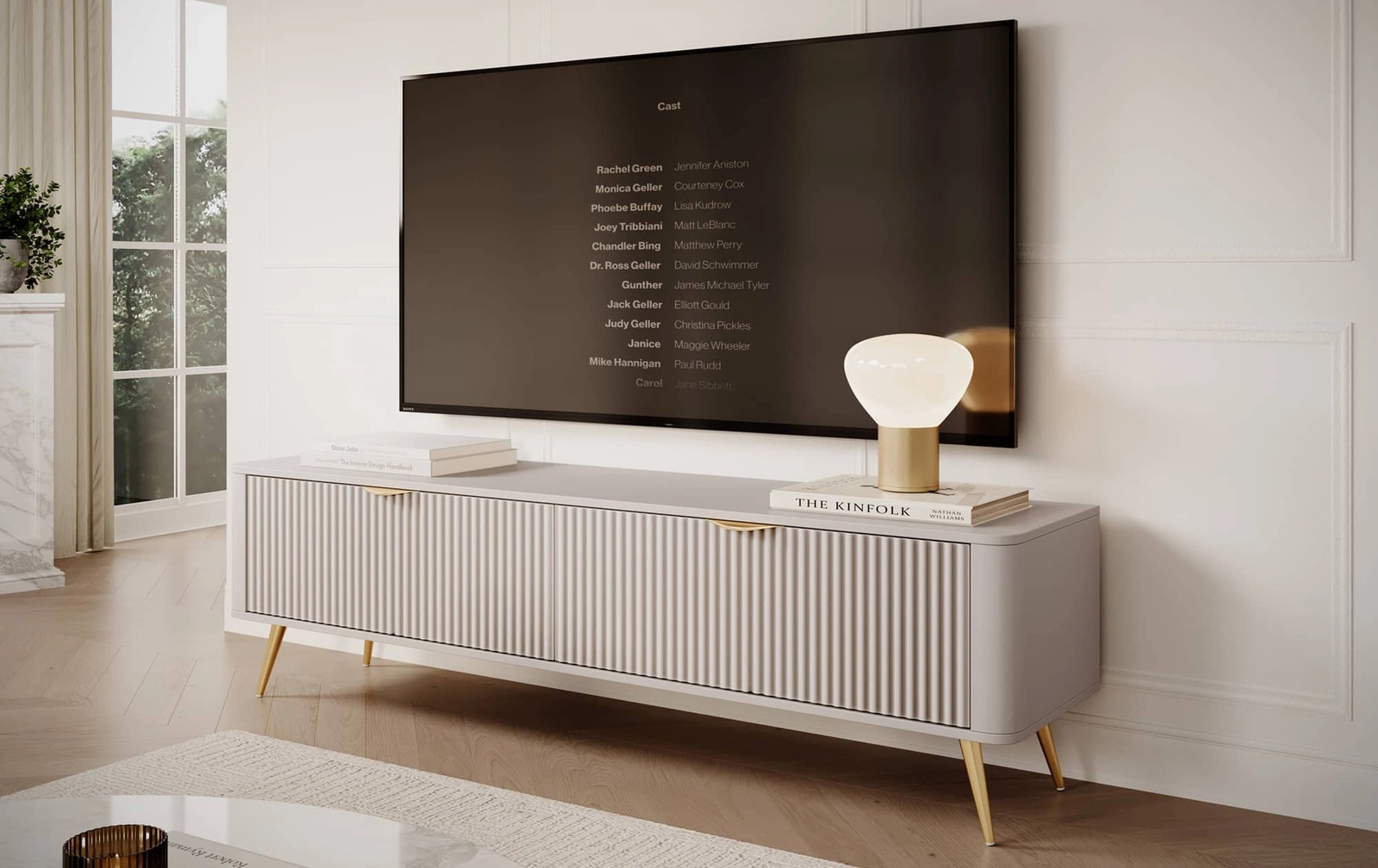 - Der Lante RTV-Schrank ist ein sehr elegantes und originelles Möbelstück. Die ovale Form, die geriffelten Fronten und die Kantengriffe sorgen für einen außergewöhnlichen Akzent. Die hohen, abgewinkelten Beine in Gold lassen den Schrank extrem schick ausseh