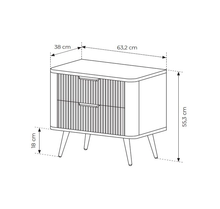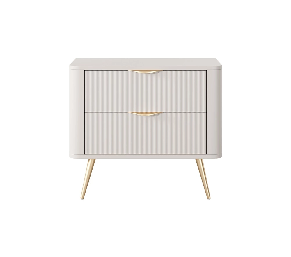 Geriffelte Fronten wurden hergestellt aus mDF. Der Korpus des Nachttischs ist gefertigt aus hochwertige 16 mm dicke laminierte Platte, die resistent gegen äußere Einflüsse wie Druckstellen, Stöße und unglückliche Kratzer ist. Die Struktur des Mobiliars wurde mit Gold verziert mit Gold metallbeine. Präzise Verarbeitung und Liebe zum Detail dafür sorgen, dass der Nachttisch viele Jahre lang sein schönes Aussehen behält, ohne an Funktionalität zu verlieren.