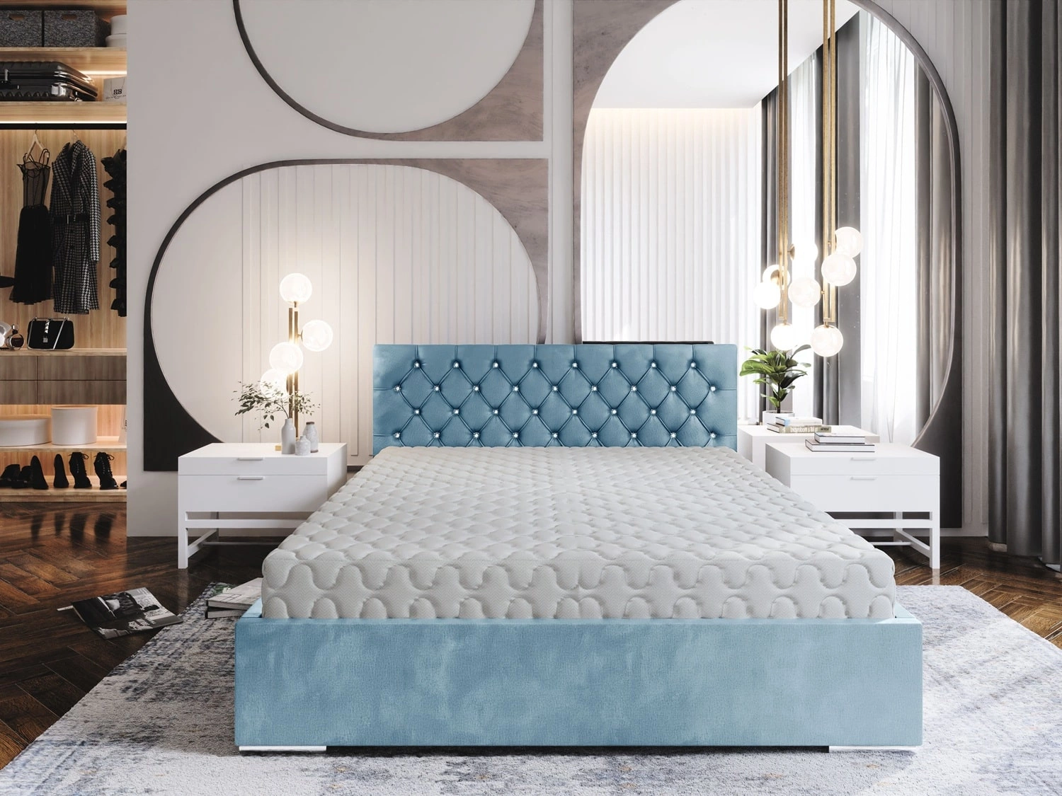 Polsterbett Bauru 140x200 türkis Bett mit Container im modernen skandinavischen Stil mit gestepptem Kopfteil mit Kristallen