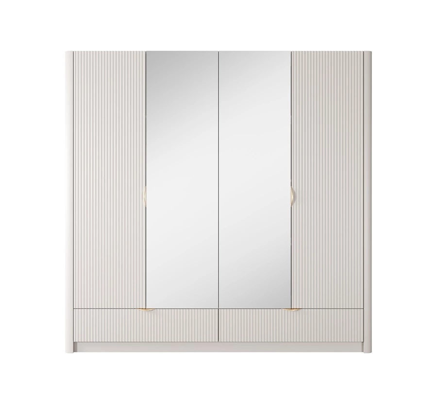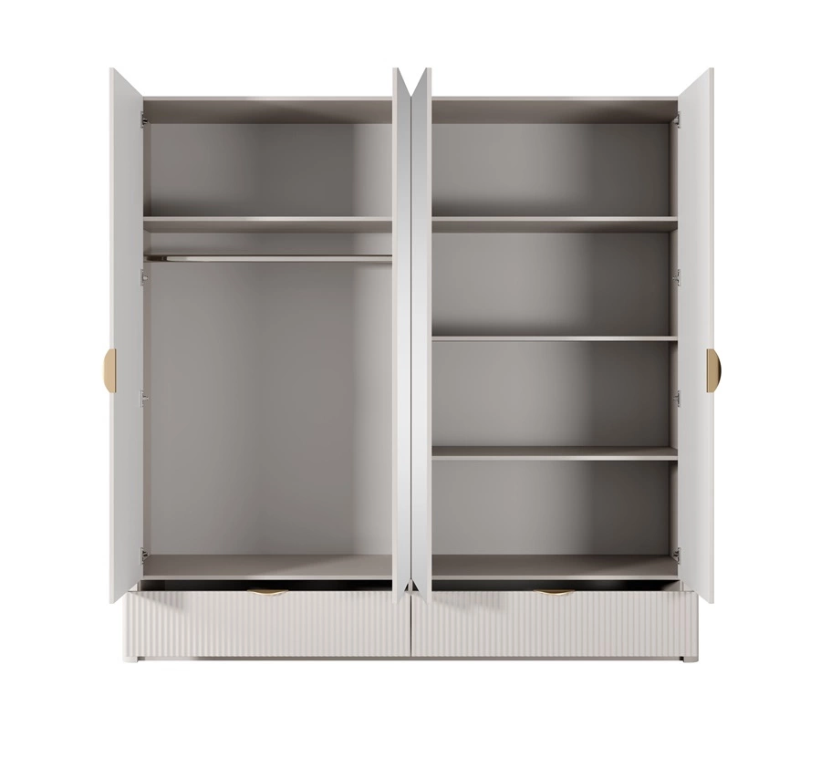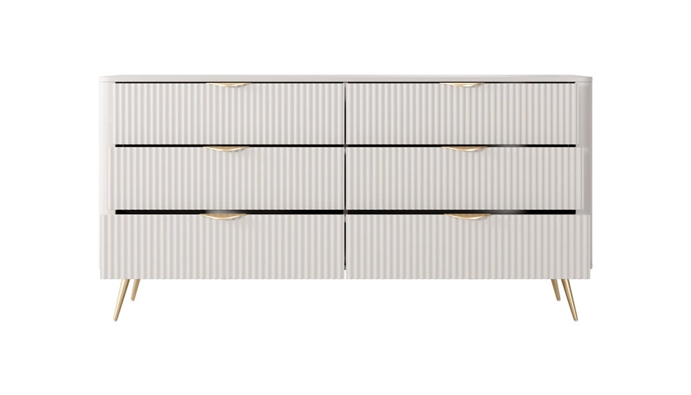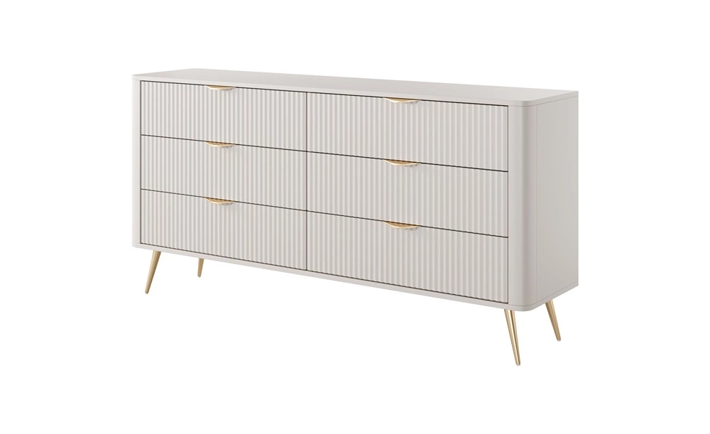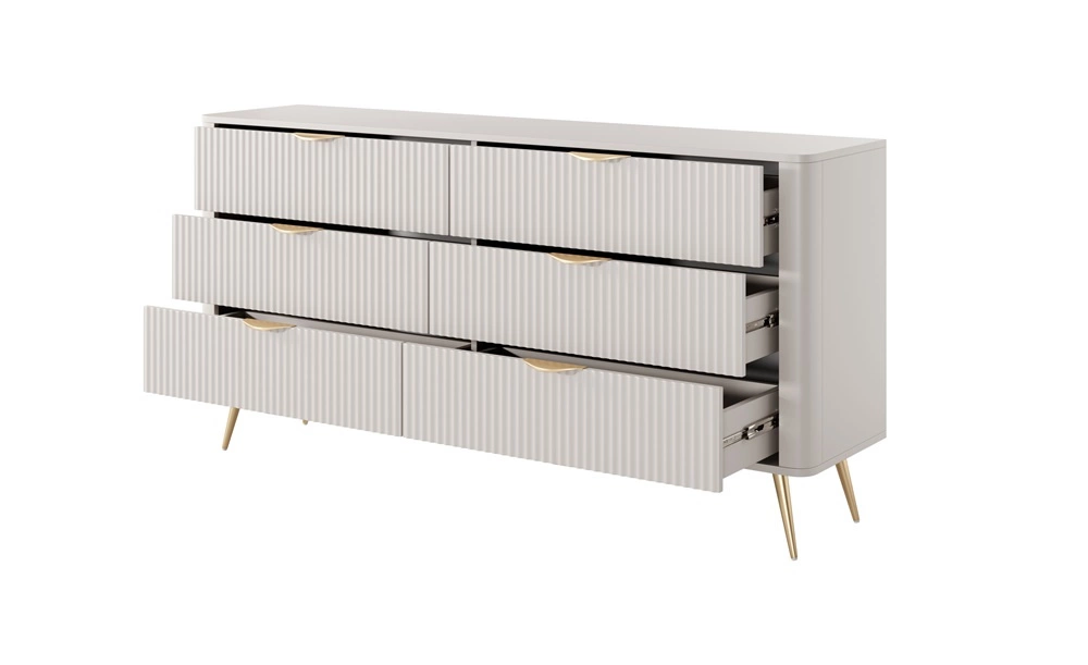 Geriffelte Fronten sind hergestellt aus mDF. Die Möbelkörper sind hergestellt aus hochwertiger 16 mm starker Schichtstoffplatte, die resistent gegen äußere Einflüsse wie Druckstellen, Stöße und unglückliche Kratzer ist. Das Design der Möbel ist abwechslungsreich mit goldenen metallbeine. Präzise Verarbeitung und Liebe zum Detail dafür sorgen, dass Schlafzimmermöbel über viele Jahre hinweg ihr schönes Aussehen behalten, ohne an Funktionalität zu verlieren.