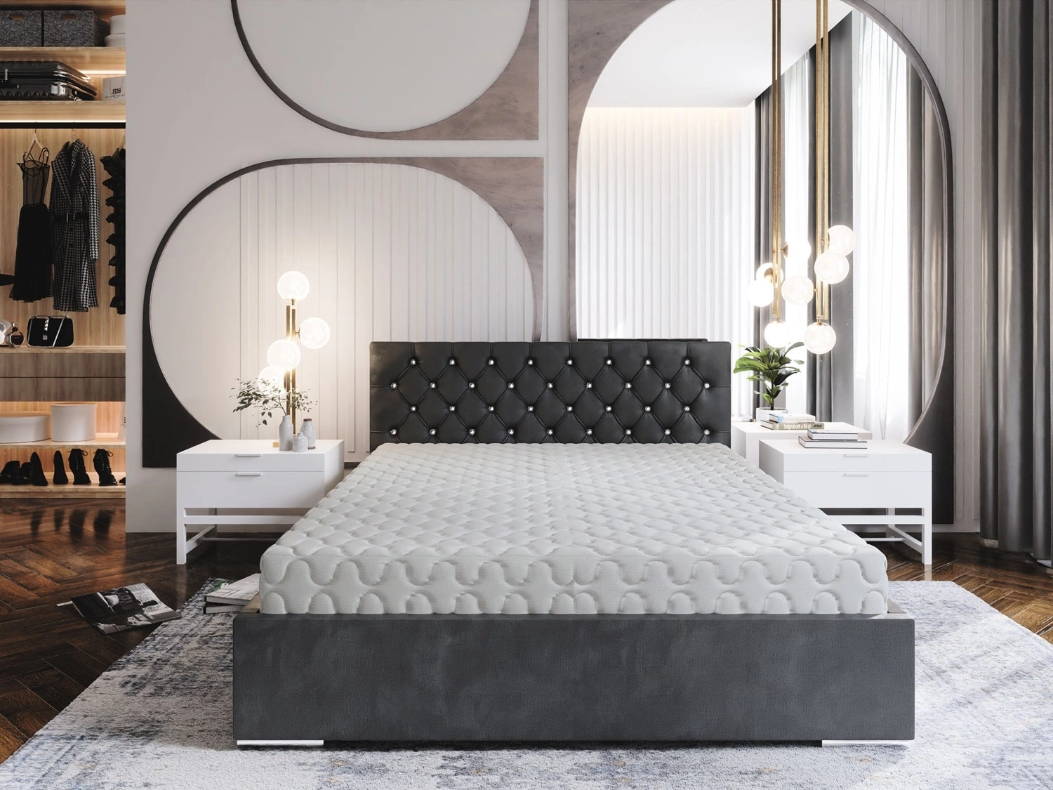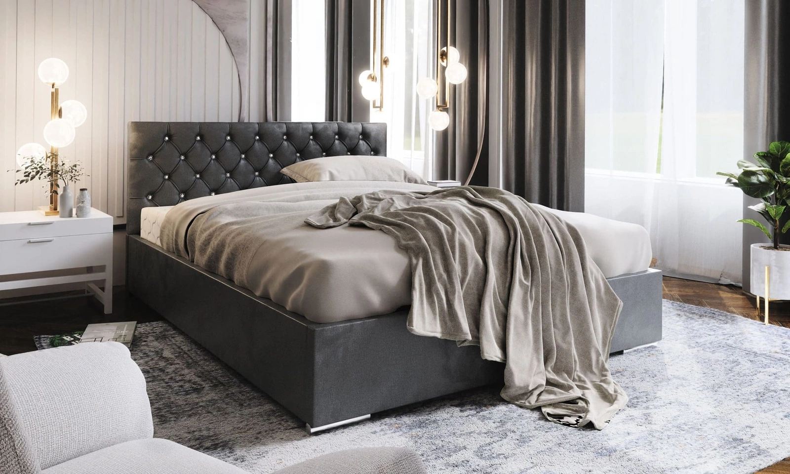 - Das Polsterbett Bauru ist eine ideale Lösung für modern, skandinavisch und klassisch eingerichtete Schlafzimmer. Die Konstruktion des Bettes gewährleistet eine hohe Stabilität und einen hohen Nutzungskomfort. Gesteppte, mit Kristallen besetzte Kopfstütze