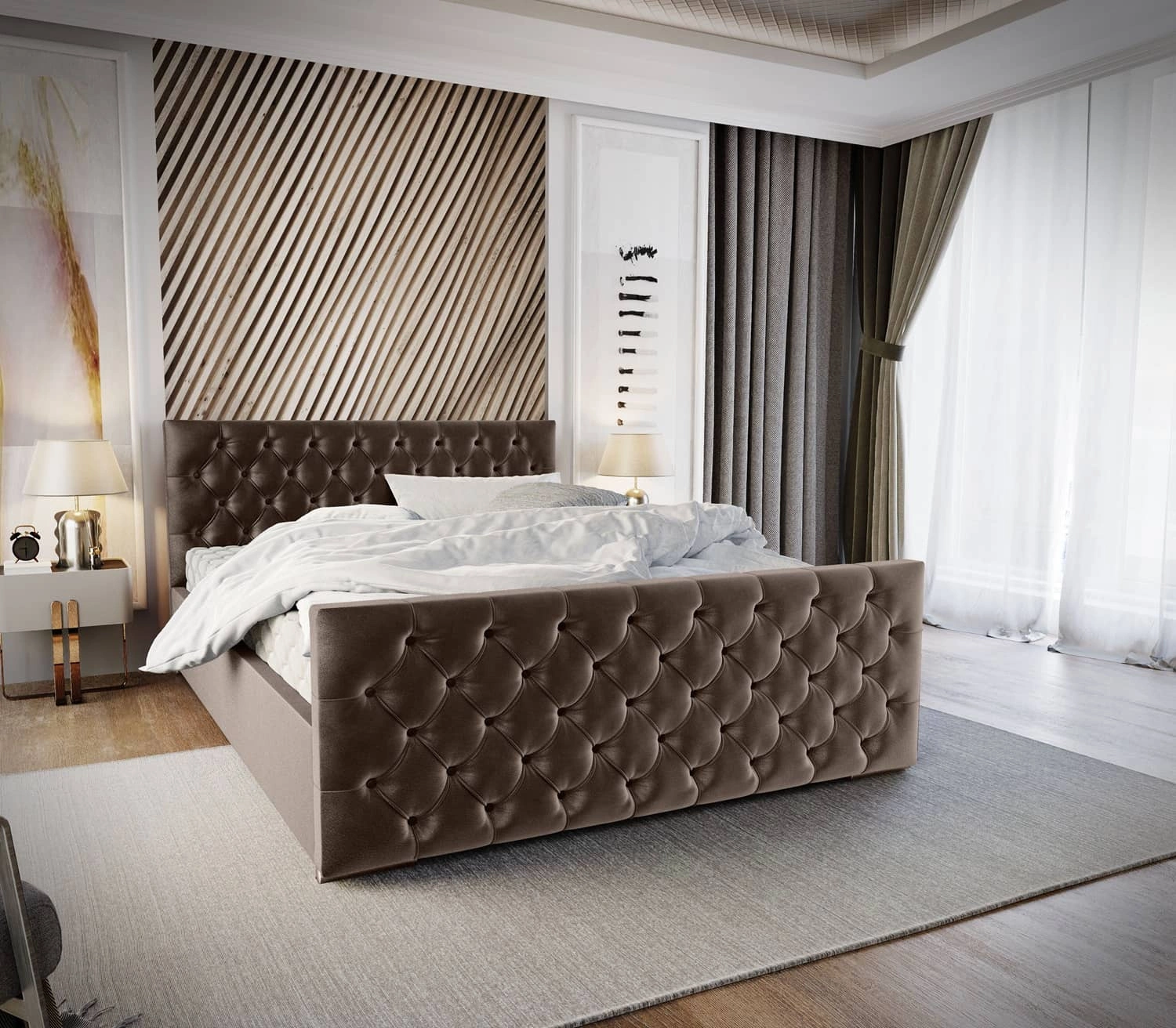 Polsterbett Viamao 160x200 hellbraun mit Container im modernen skandinavischen Stil mit gestepptem Kopfteil und Fußteil