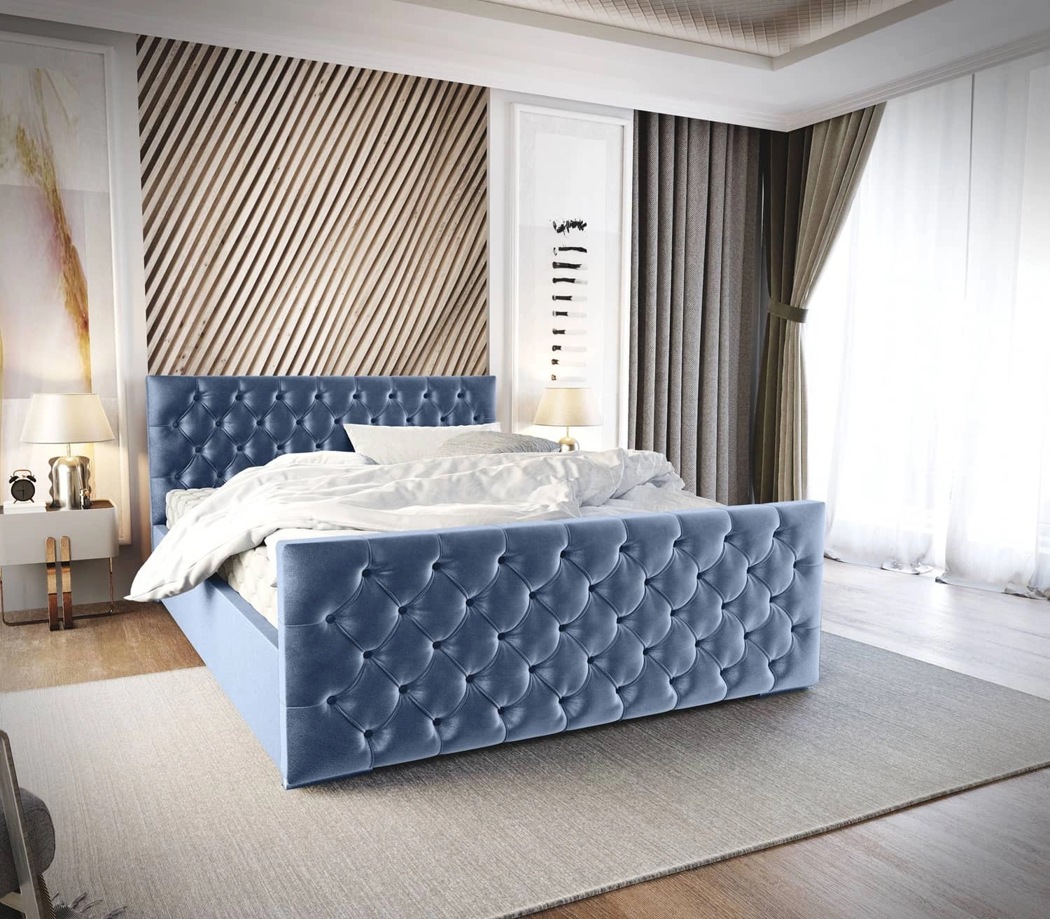 Polsterbett Viamao 160x200 blau mit Container im modernen skandinavischen Stil mit gestepptem Kopfteil und Fußteil