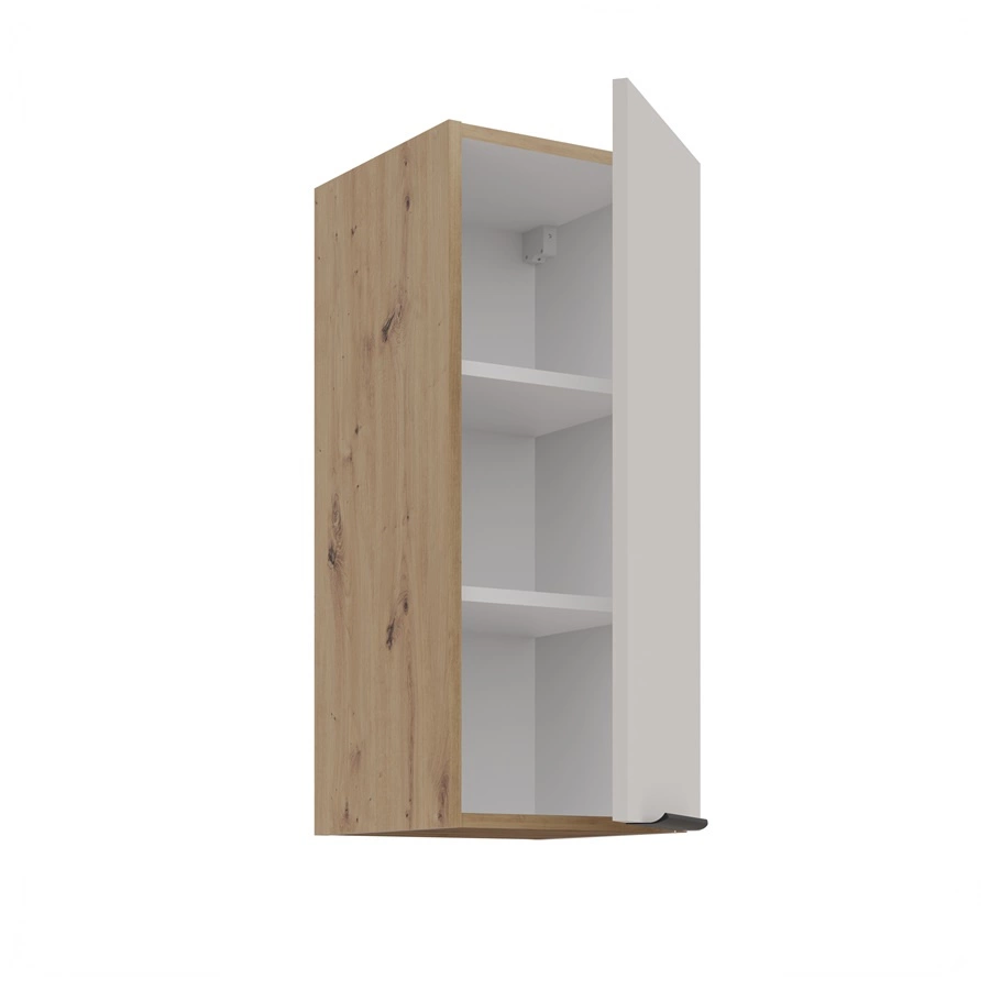 Der 30 cm hohe Soela-Küchenhängeschrank in Eiche artisan / beige gehört zur Kategorie der modularen Küchenmöbel, aus denen sich jedes gewünschte Set zusammenstellen lässt.