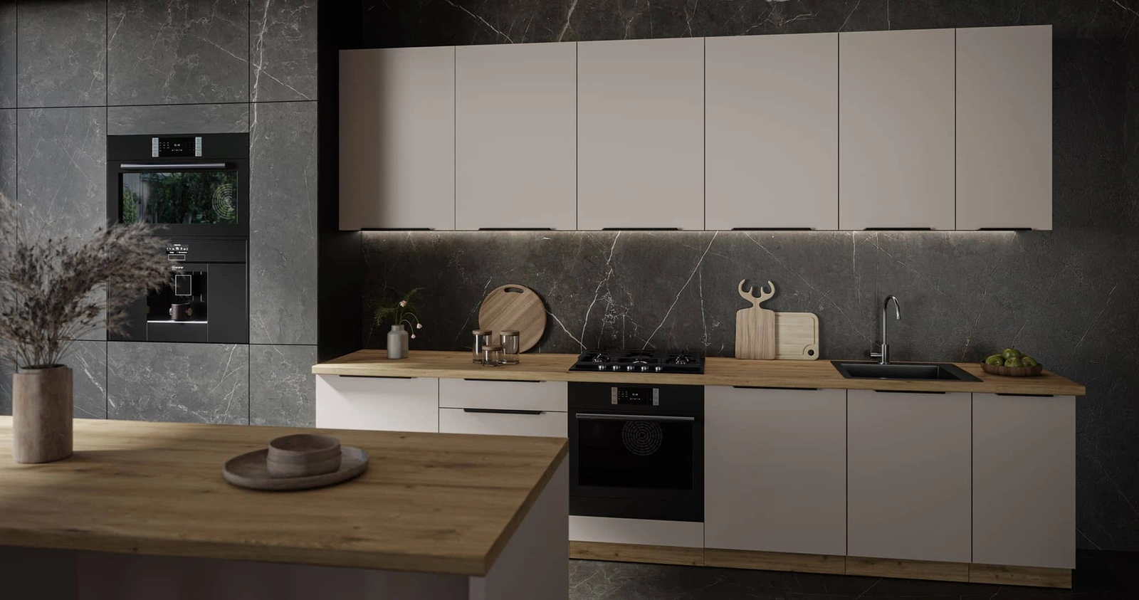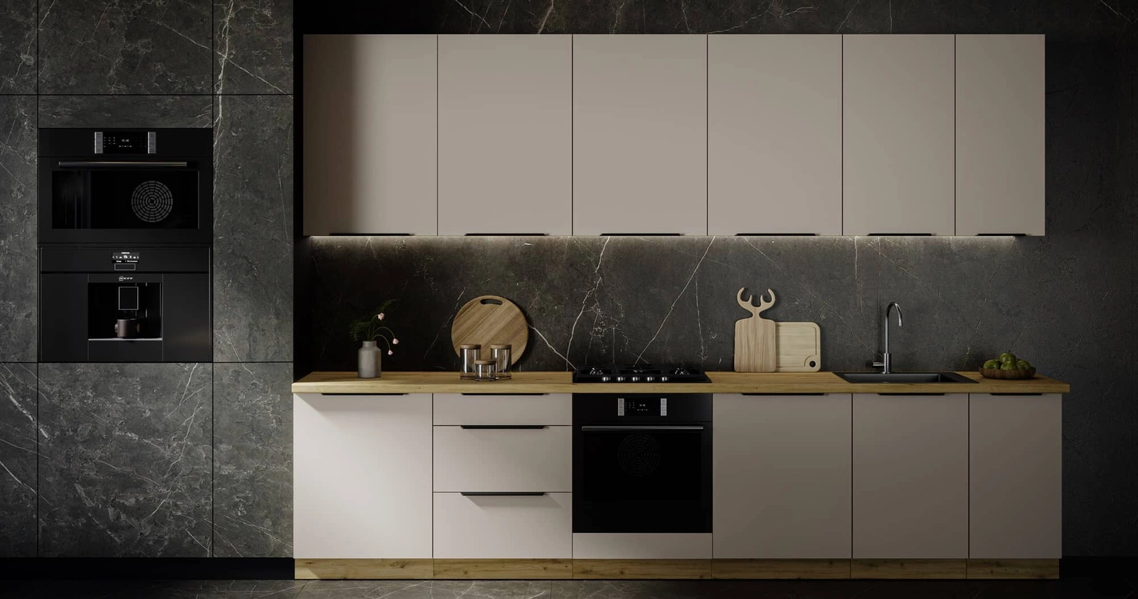 Die Korpusse und Fronten der Küchenschränke wurden aus hochwertige 16 mm dicke laminierte Platte. Der Vorteil dieser Art von Material ist hohe Widerstandsfähigkeit gegen äußere Einflüsse wie Dampf, Hitze, Feuchtigkeit, verschüttete Flüssigkeiten. Das verwendete Material ist außerdem widerstandsfähig auf zufällige Beschädigung. Eine stilvolle Ergänzung zu Küchenschrankfronten sind schwarz, metallkantenhalterungen, die neben ihrer Hauptfunktion auch das moderne Design der Schränke unterstreichen.