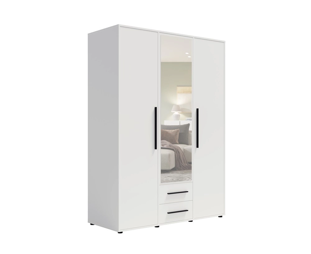 Der Osma Kleiderschrank ist unterteilt in zwei teile mit Stange zum Aufhängen von Kleidung i teil mit Regalen. Geräumige Schubladen zusätzlichen Stauraum bieten. Garderobe ist hergestellt aus hochwertiger laminierter Karton 16 mm dick, die resistent gegen äußere Einflüsse wie Druckstellen, Stöße und unglückliche Kratzer ist. Die mittlere Tür des Kleiderschranks ist mit einem großen Spiegel versehen spiegel, aufhellung und optische Vergrößerung des Raumes. Die stilvollen Abschlüsse der Fronten sind schlichtes Schwarz griffe, die zusätzlich zu ihrer Hauptfunktion ein äußerst geschmackvolles Erscheinungsbild bieten. Die Garderobe ist äußerst benutzerfreundlich gestaltet und bietet viel Stauraum.